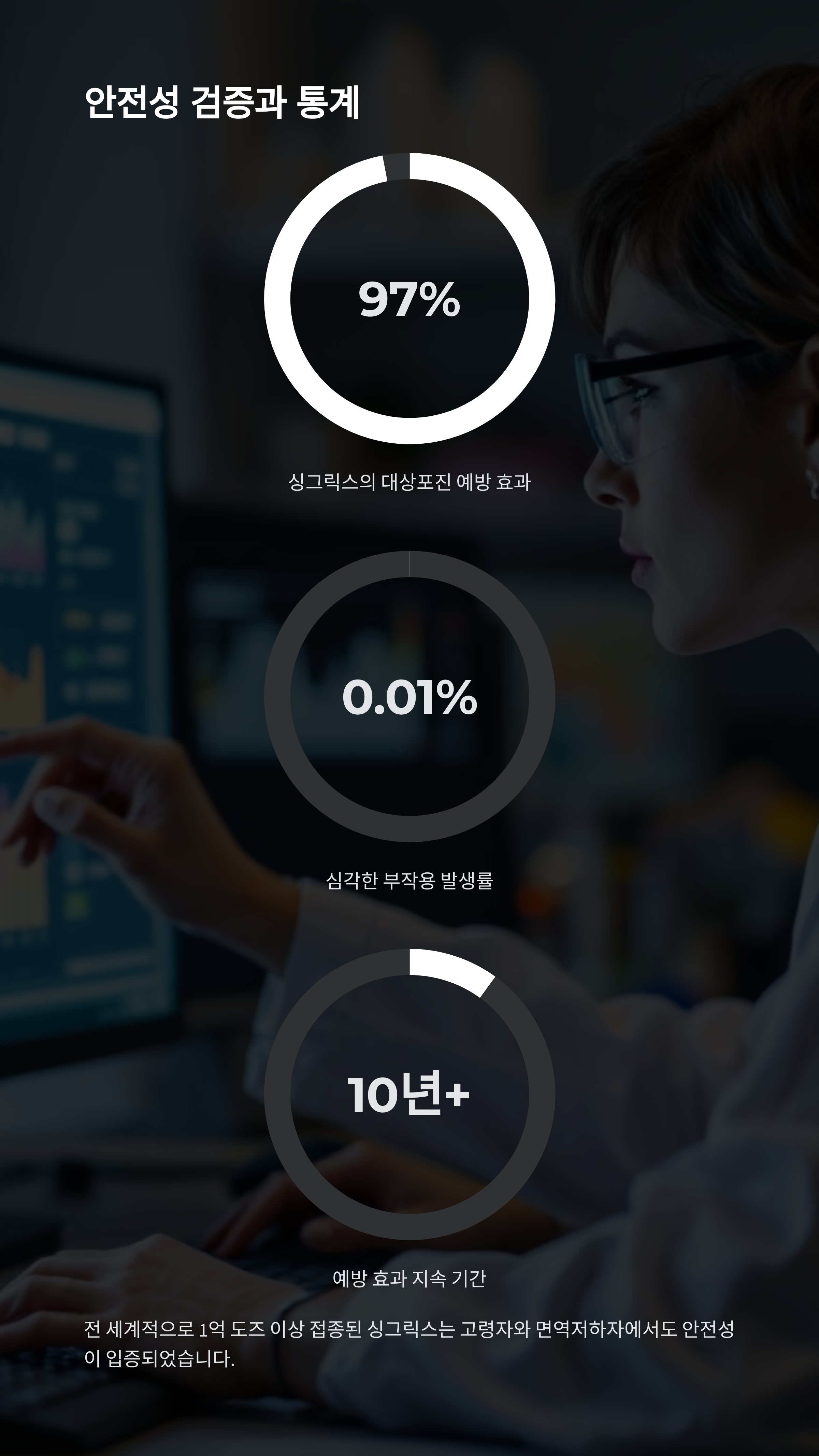 미국 FDA와 유럽 EMA, 한국 식약처 등 주요 국가의 규제기관에서 모두 승인받은 백신이에요. 특히 싱그릭스는 2017년 승인 이후 전 세계적으로 1억 도즈 이상 접종되었는데, 심각한 부작용 발생률은 0.003% 미만이에요. 정말 안전하다고 볼 수 있죠!