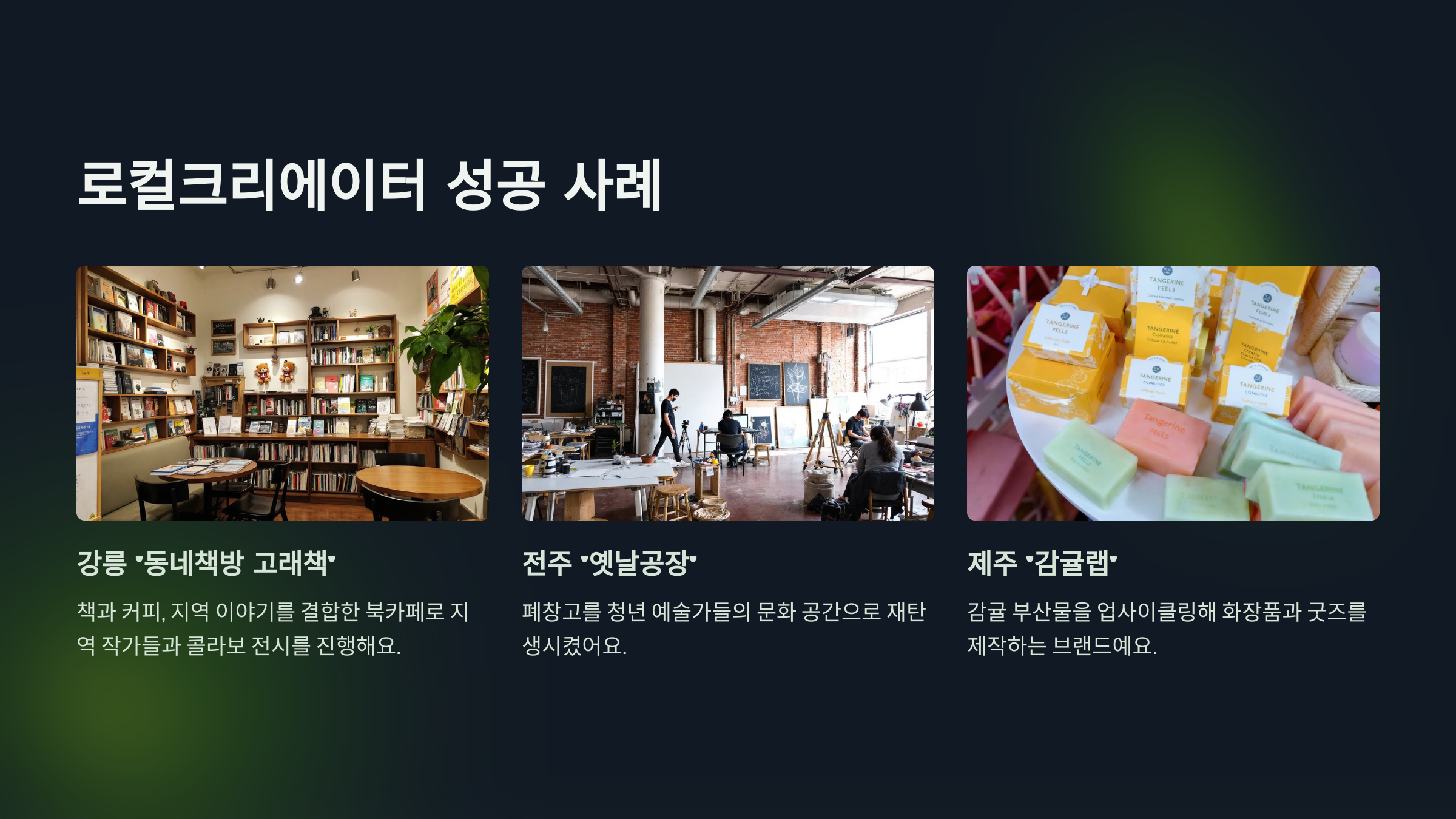 사례 ② 전주 ‘옛날공장’ 오래된 폐창고를 활용해 지역 청년 예술가들이 함께 작업하는 문화 공간으로 재탄생시킨 사례예요. 리모델링과 디자인 자금은 로컬크리에이터 사업으로 지원받았고, 지금은 마켓, 워크숍, 공연까지 열리는 대표 복합문화공간이 됐어요 🎨