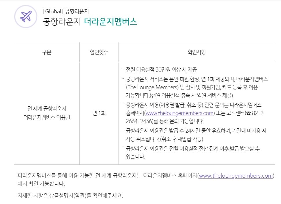 📌라운지 이용: 연간 2회 무료 방문, 반기별로 1회 이용 가능, 전월 30만원 이용시 가능함.