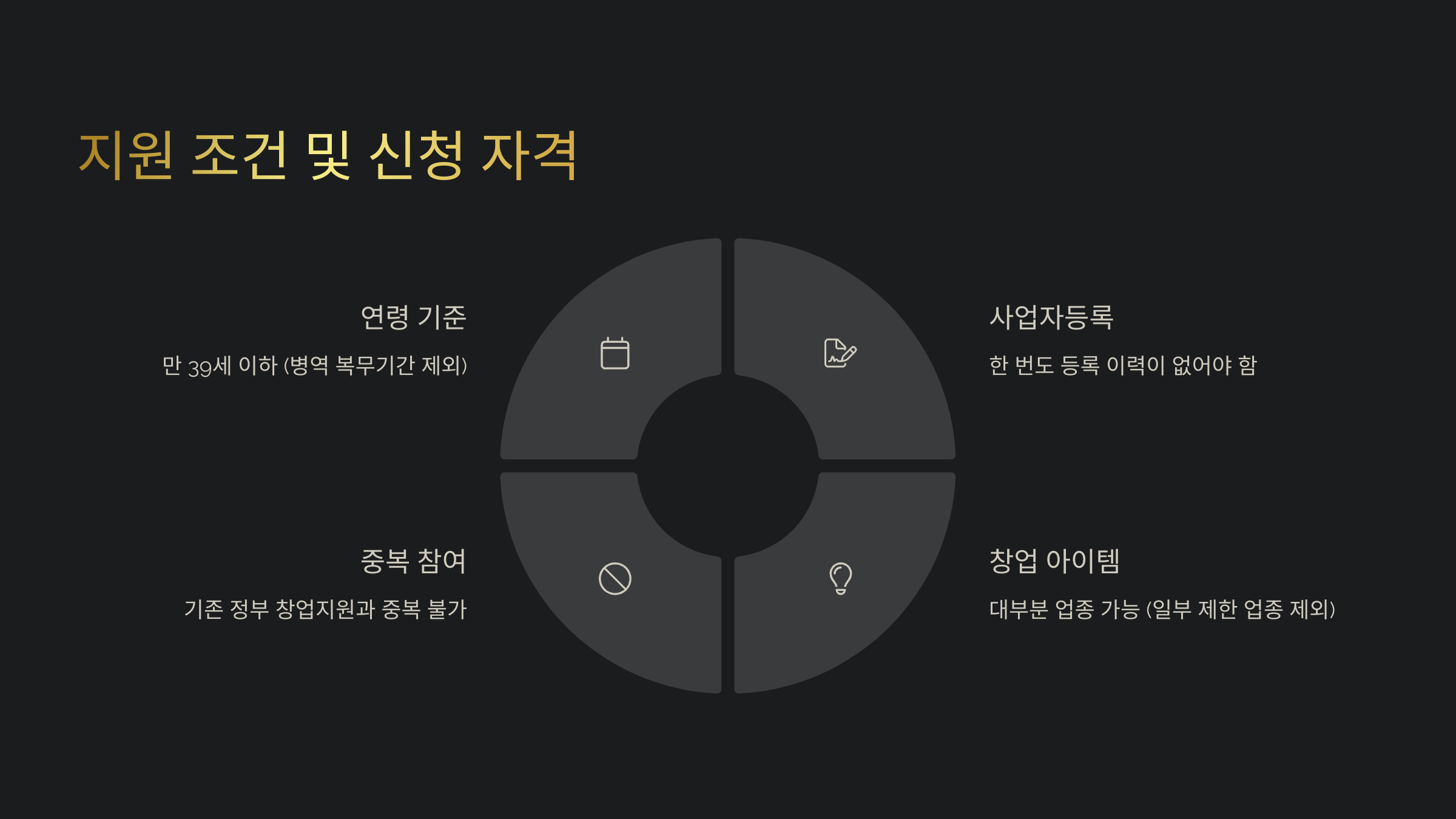A1. 만 39세 이하이며, 한 번도 사업자등록을 해본 적이 없는 예비창업자만 가능해요. 이미 창업 경험이 있거나 기존에 사업자등록을 한 적 있다면 대상에서 제외돼요.