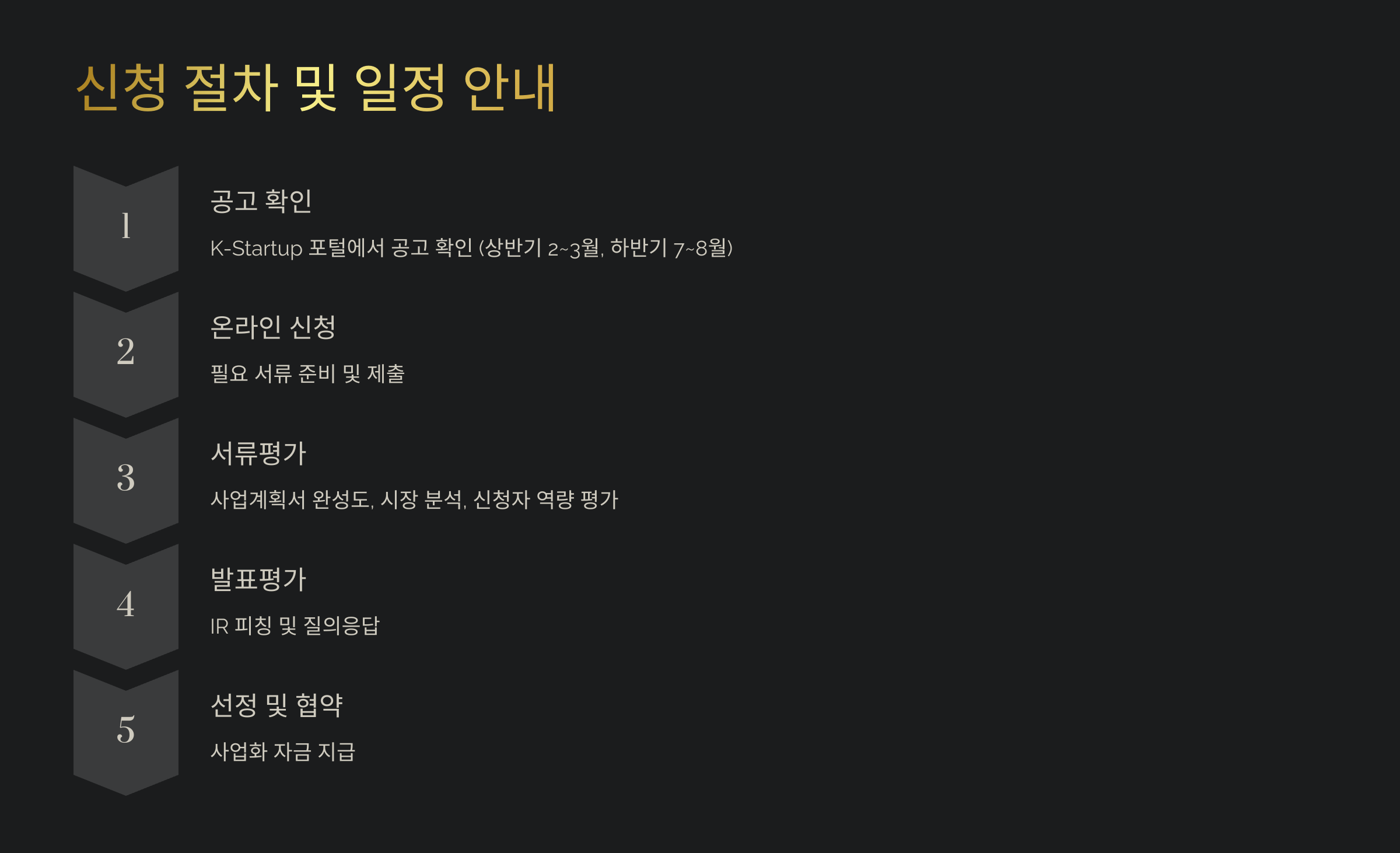 먼저 해야 할 일은 K-Startup(https://www.k-startup.go.kr)에 회원가입을 하고, 공고 알림을 설정하는 거예요. 공고가 올라오면 바로 확인하고 빠르게 준비해야 해요. 마감일이 짧게 설정된 경우도 많거든요!