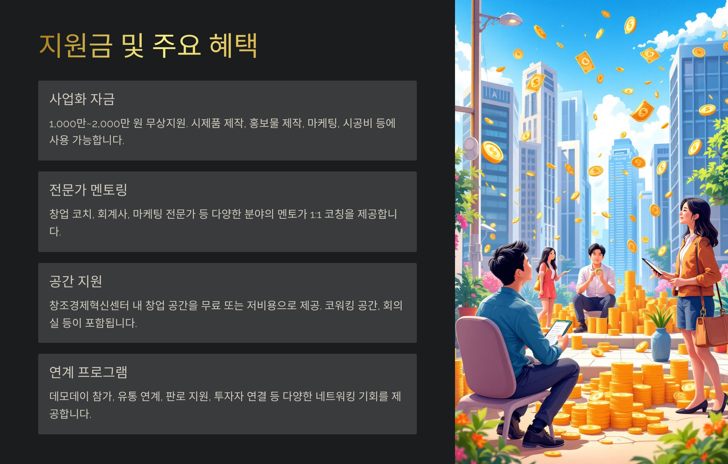 | 지원 내용 | 자금+교육+멘토링+공간 등 종합 지원 |