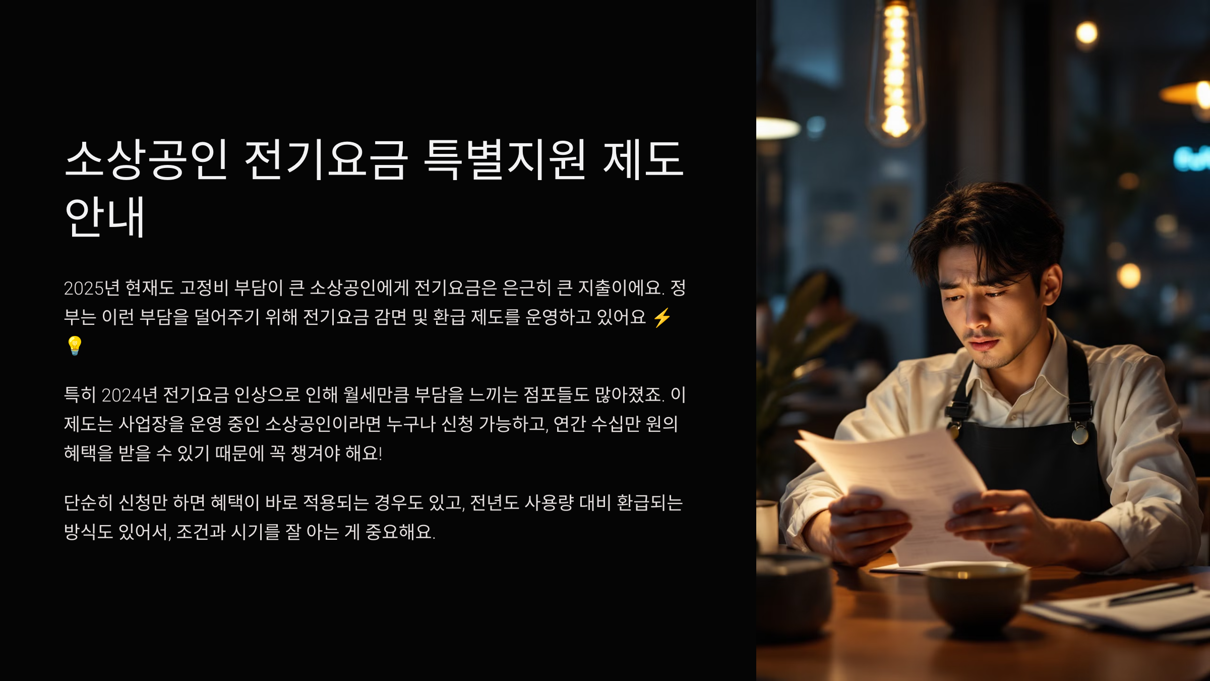 소상공인을 위한 전기요금 특별지원 제도, 알고 계셨나요? 2025년 현재도 고정비 부담이 큰 소상공인에게 전기요금은 은근히 큰 지출이에요. 정부는 이런 부담을 덜어주기 위해 전기요금 감면 및 환급 제도를 운영하고 있어요 ⚡💡