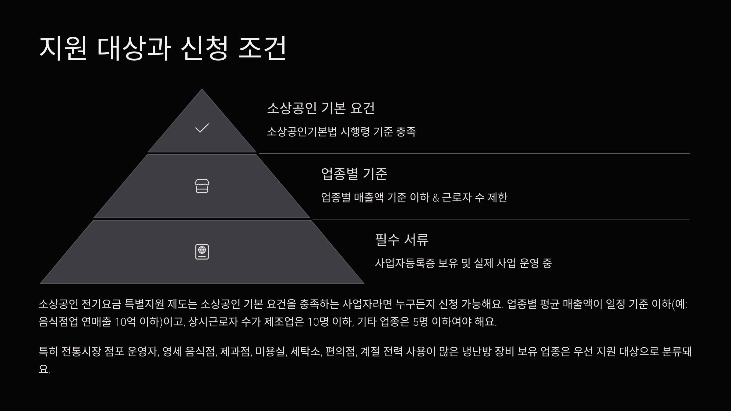 기본적으로는 소상공인 기준을 충족하는 사업자면 누구나 대상이고, 전기계약을 본인 명의로 체결하고 있다면 별도 승인이 없어도 자동 적용되는 경우도 있어요. 단, 신청 절차가 필요한 경우도 있으니 정확히 알아야 해요 🧾
