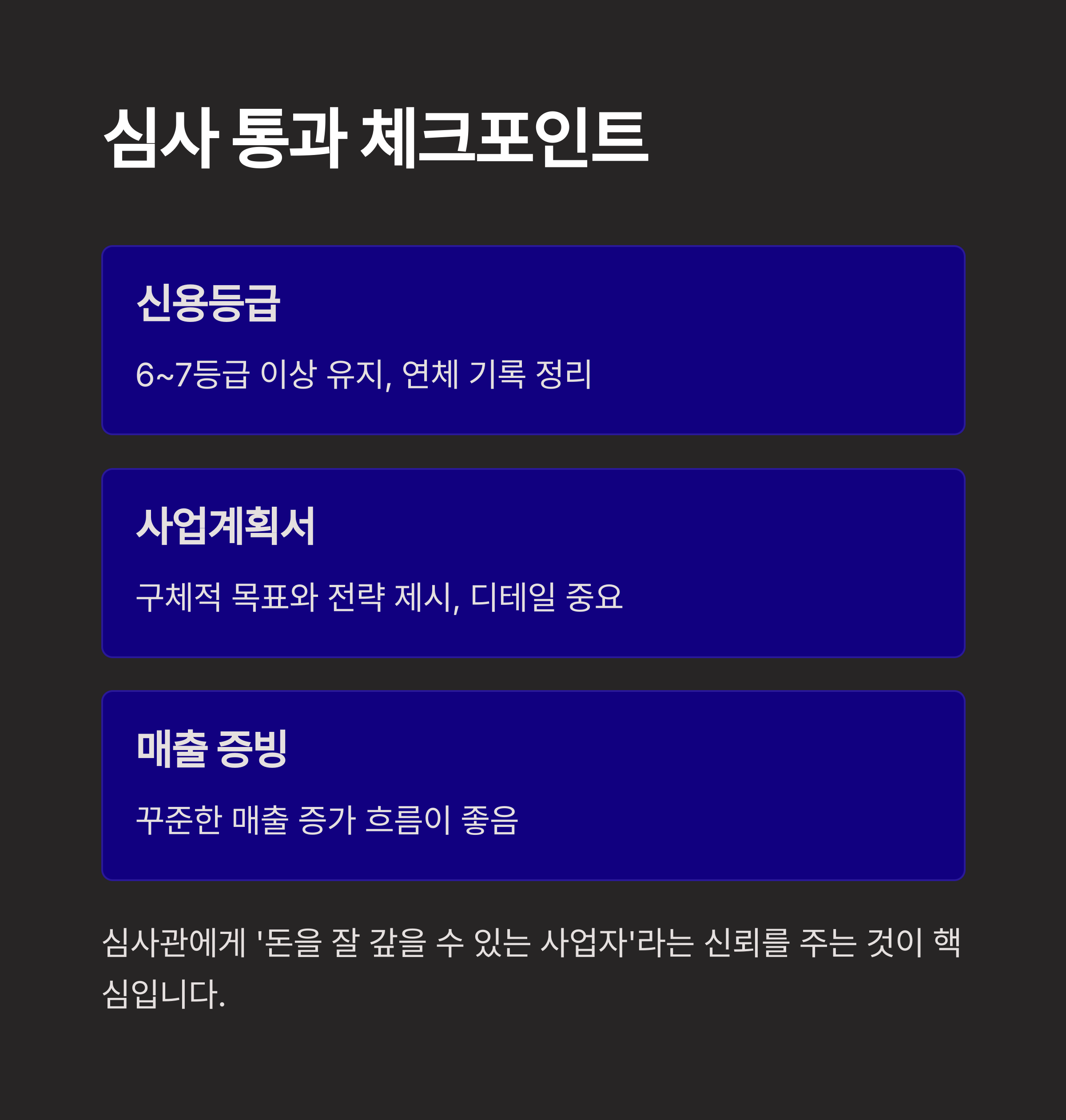 첫 번째는 신용등급이에요. 기본적으로 6등급 이상이면 좋지만, 7등급이어도 사업계획이 뛰어나거나 매출 전망이 좋으면 가능성이 있어요. 신용카드 연체나 대출 연체 기록이 있다면 미리 정리하는 게 좋아요.