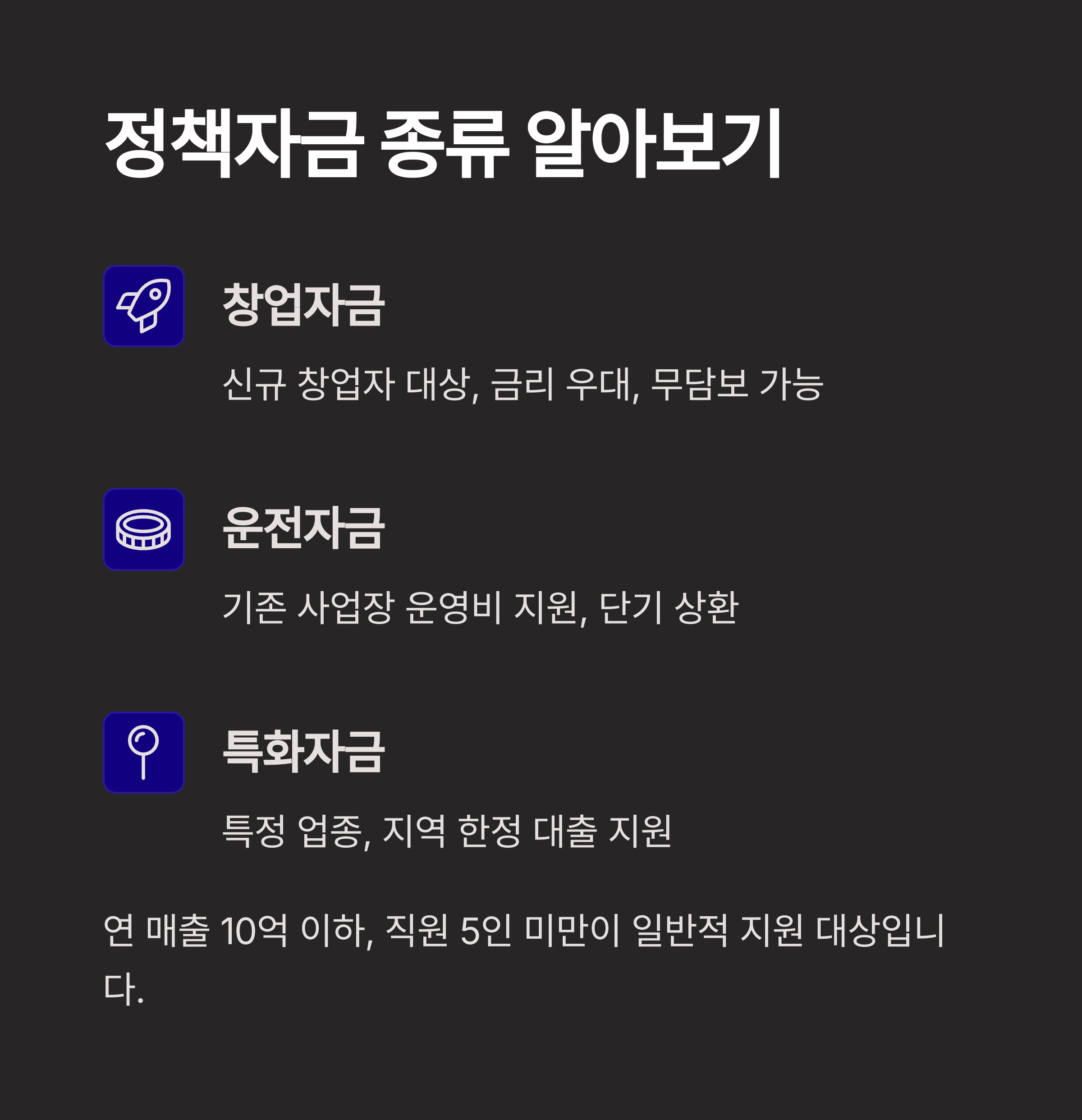 정책자금은 크게 두 가지로 나눌 수 있어요. 하나는 '창업자금', 다른 하나는 '운전자금'이에요. 창업자금은 새로 사업을 시작하는 사람을 돕기 위한 거고, 운전자금은 이미 사업을 하고 있는 소상공인의 운영자금을 지원해주는 거죠. 💼
