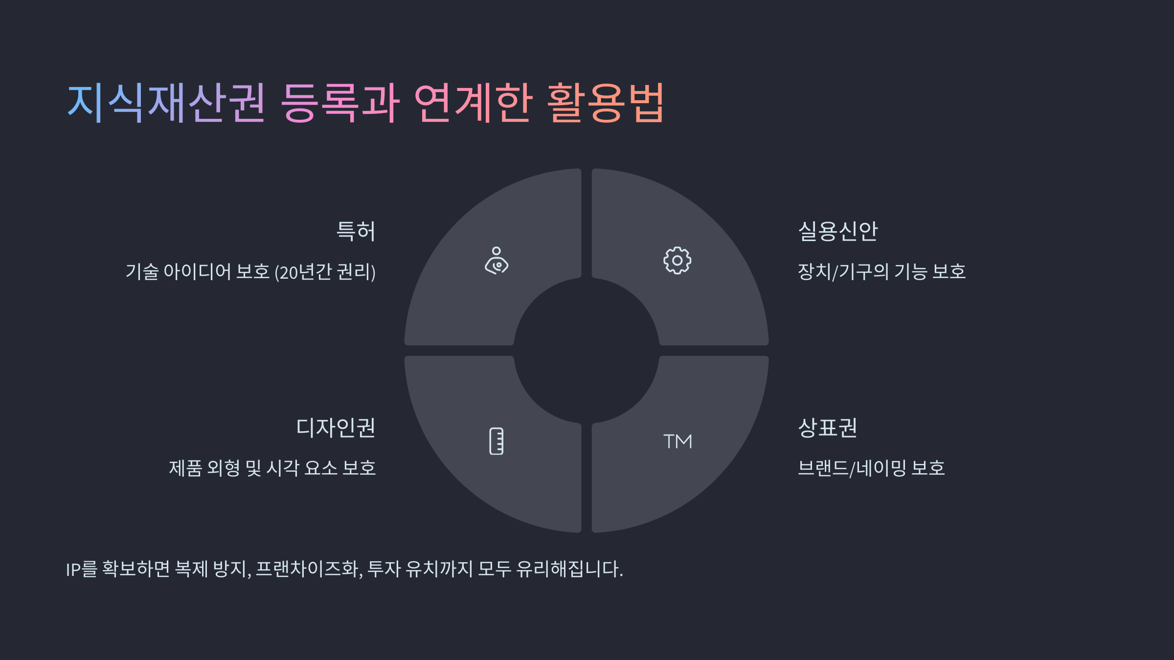 IP를 확보하면 복제 방지, 프랜차이즈화, 투자 유치까지 모두 유리해져요. 실제로 특허 등록된 창업 아이템은 벤처 인증, 공공조달 우대