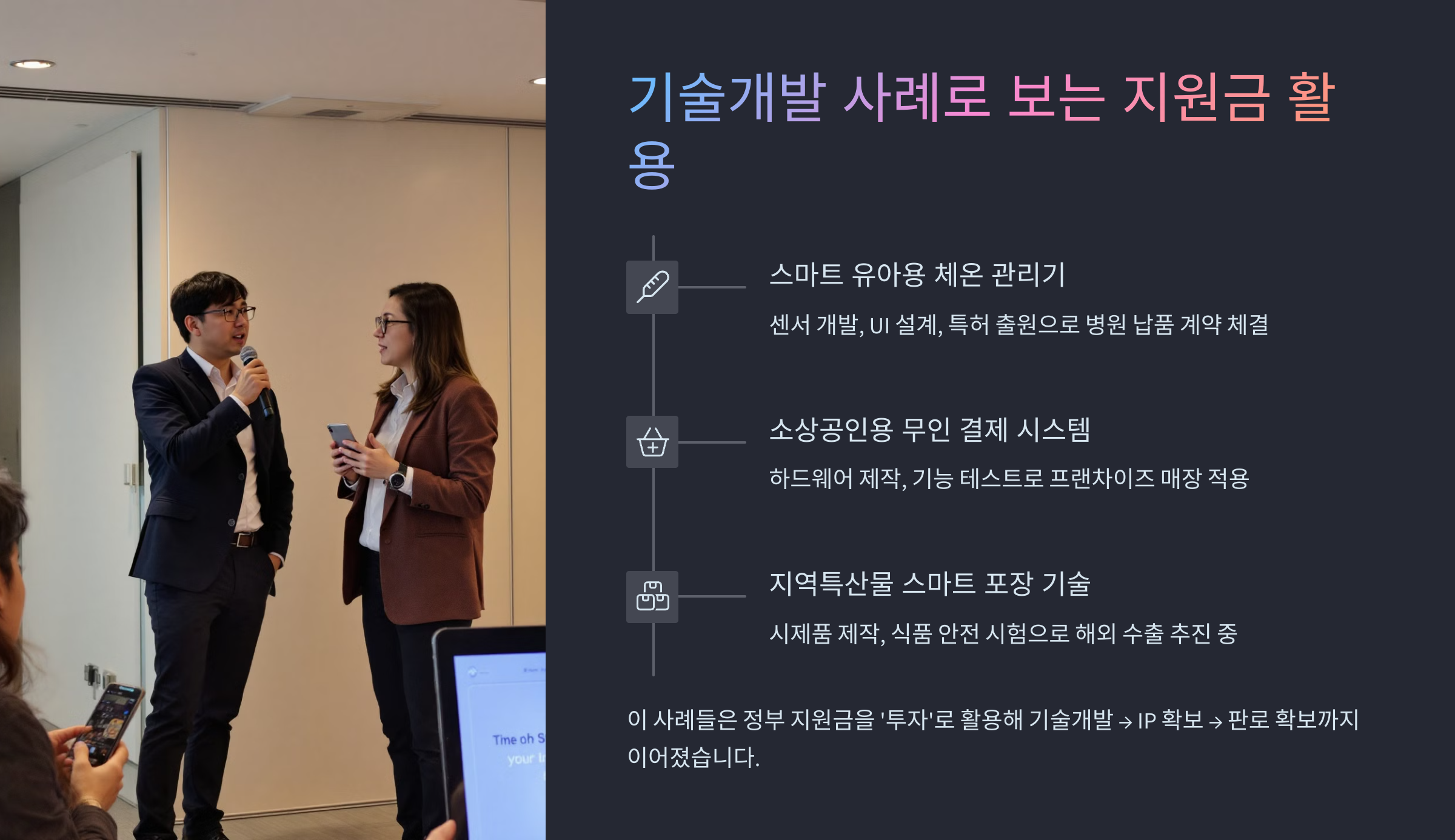 그리고 이들의 가장 큰 장점은 정부 지원금을 단순 소비가 아닌 ‘투자’로 활용했다는 점이에요. 기술개발 → IP 확보 → 판로 확보까지 이어지는 전략이 핵심이에요!