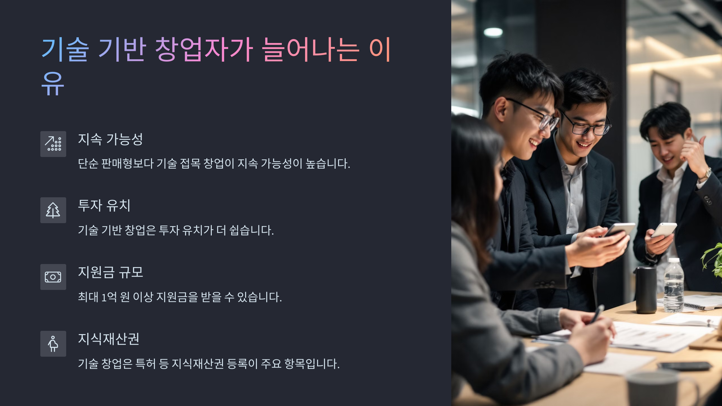 기술이 경쟁력이 되는 시대예요. 단순히 물건을 파는 창업에서 벗어나 아이디어 기반 기술 창업