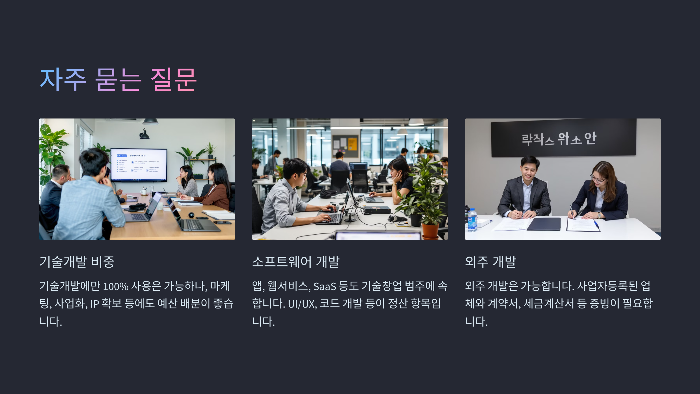 A2. 네, 가능합니다! 앱, 웹서비스, SaaS 등도 모두 기술창업 범주에 속하며, UI/UX, 코드 개발, 베타버전 제작 등이 정산 항목에 포함돼요.