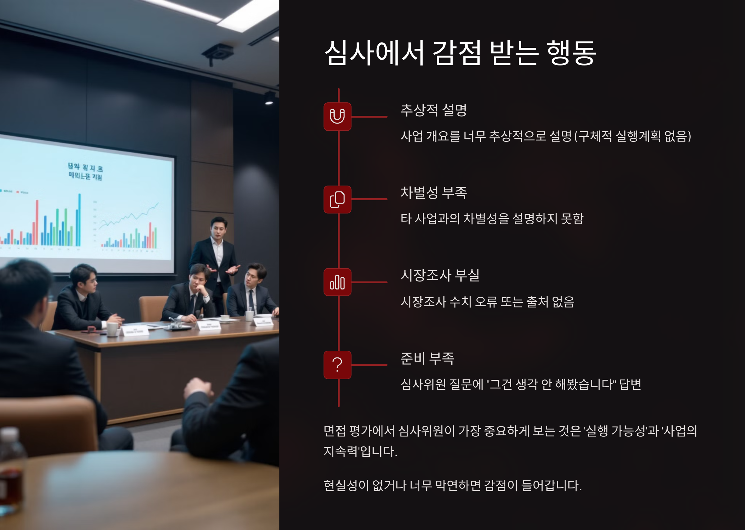 특히 면접(대면평가)이 있는 경우 심사위원이 가장 중요하게 보는 건 ‘실행 가능성’과 ‘사업의 지속력’이에요. 즉, 현실성이 없거나 너무 막연하면 감점이 들어가요.