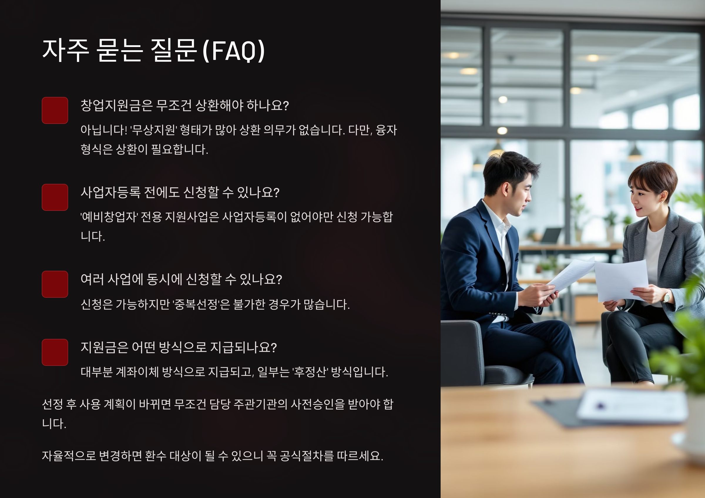 A1. 아니에요! 창업지원금은 ‘무상지원’ 형태가 많아서 상환 의무가 없어요. 다만, 융자 형식(정책자금)은 상환이 필요하니 공고 유형을 꼭 확인하세요.