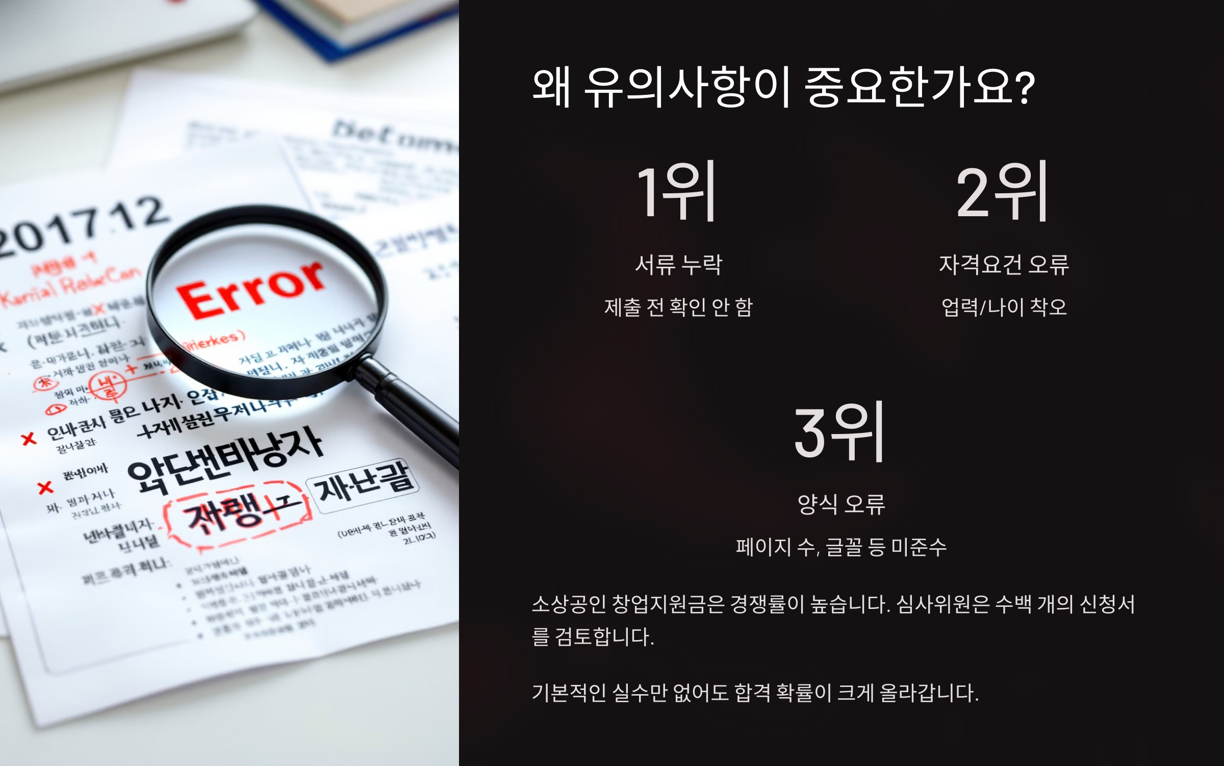 소상공인 창업지원금은 경쟁률이 높아요. 심사위원도 수십, 수백 개의 신청서를 보기 때문에 기본적인 실수만 없더라도 합격 확률이 훨씬 올라가요.