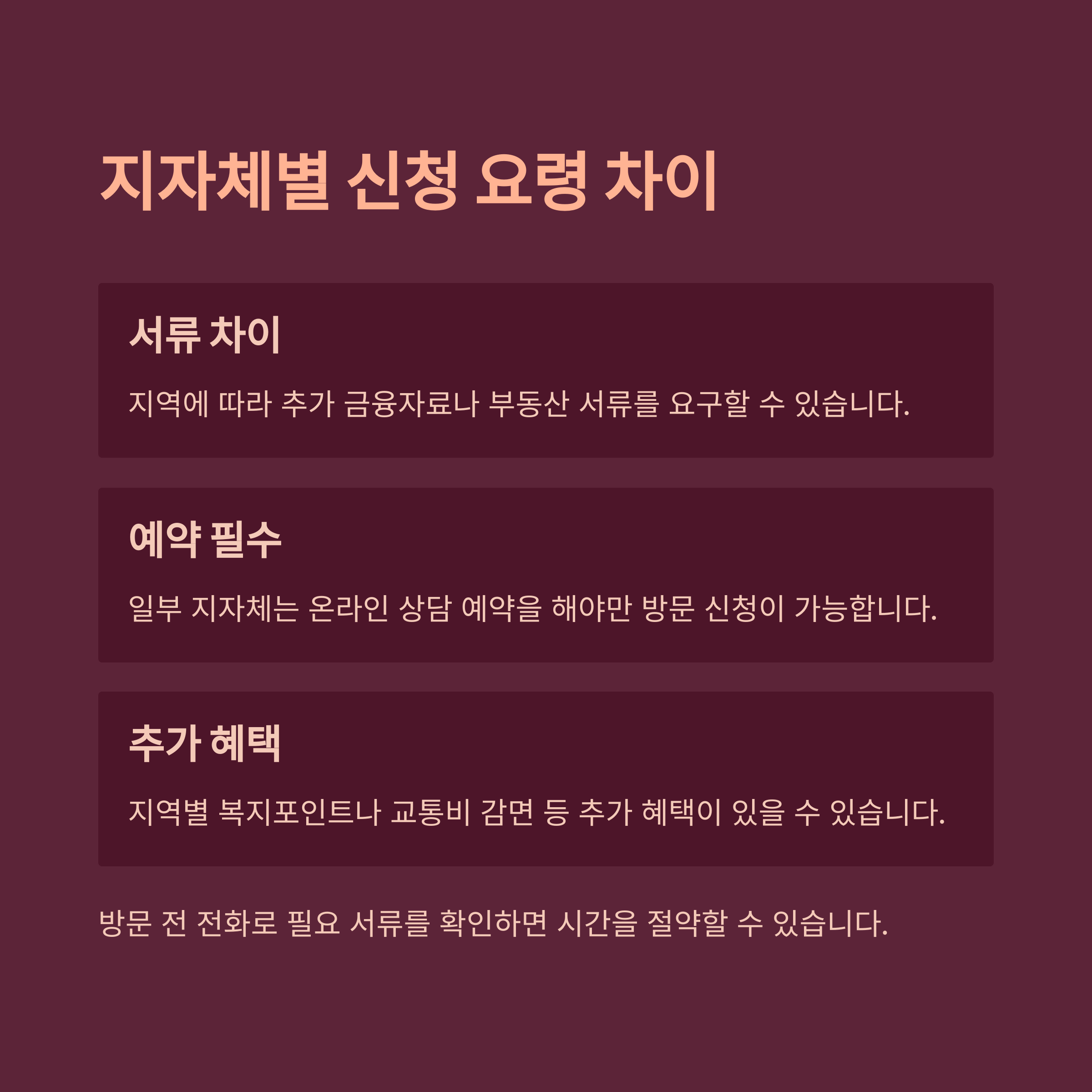 어떤 지역에서는 가족관계증명서 외에도 추가적으로 금융자료나 부동산 서류를 요구하기도 해요. 또 일부 지자체는 온라인 상담 예약을 해야만 방문 신청이 가능한 곳도 있어요. 무작정 찾아가면 접수를 못 하는 경우도 있다는 점, 꼭 기억하세요.