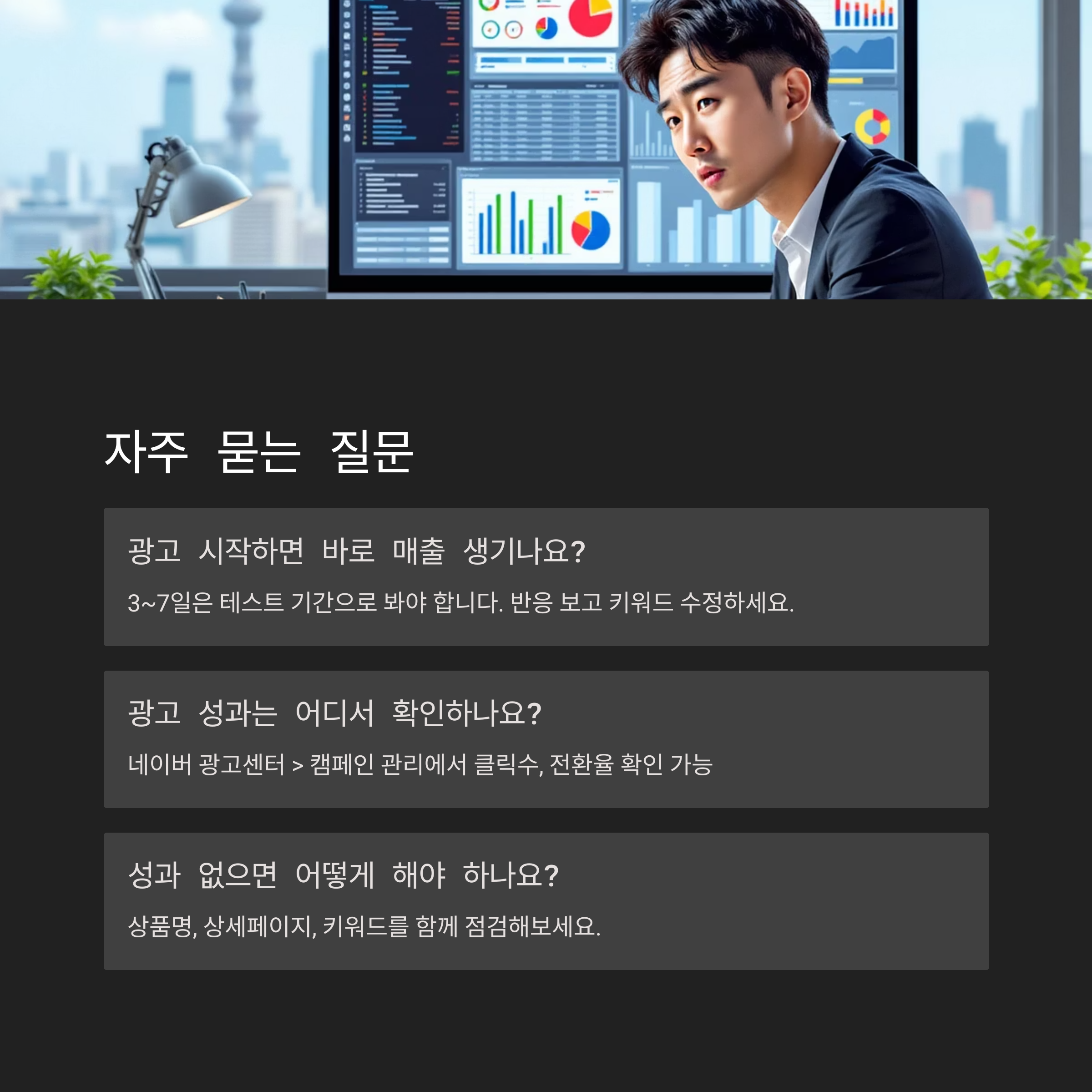 A1. 바로는 아니고, 3~7일은 테스트 기간으로 봐야 해요. 클릭률과 반응 보고 키워드를 수정하세요.