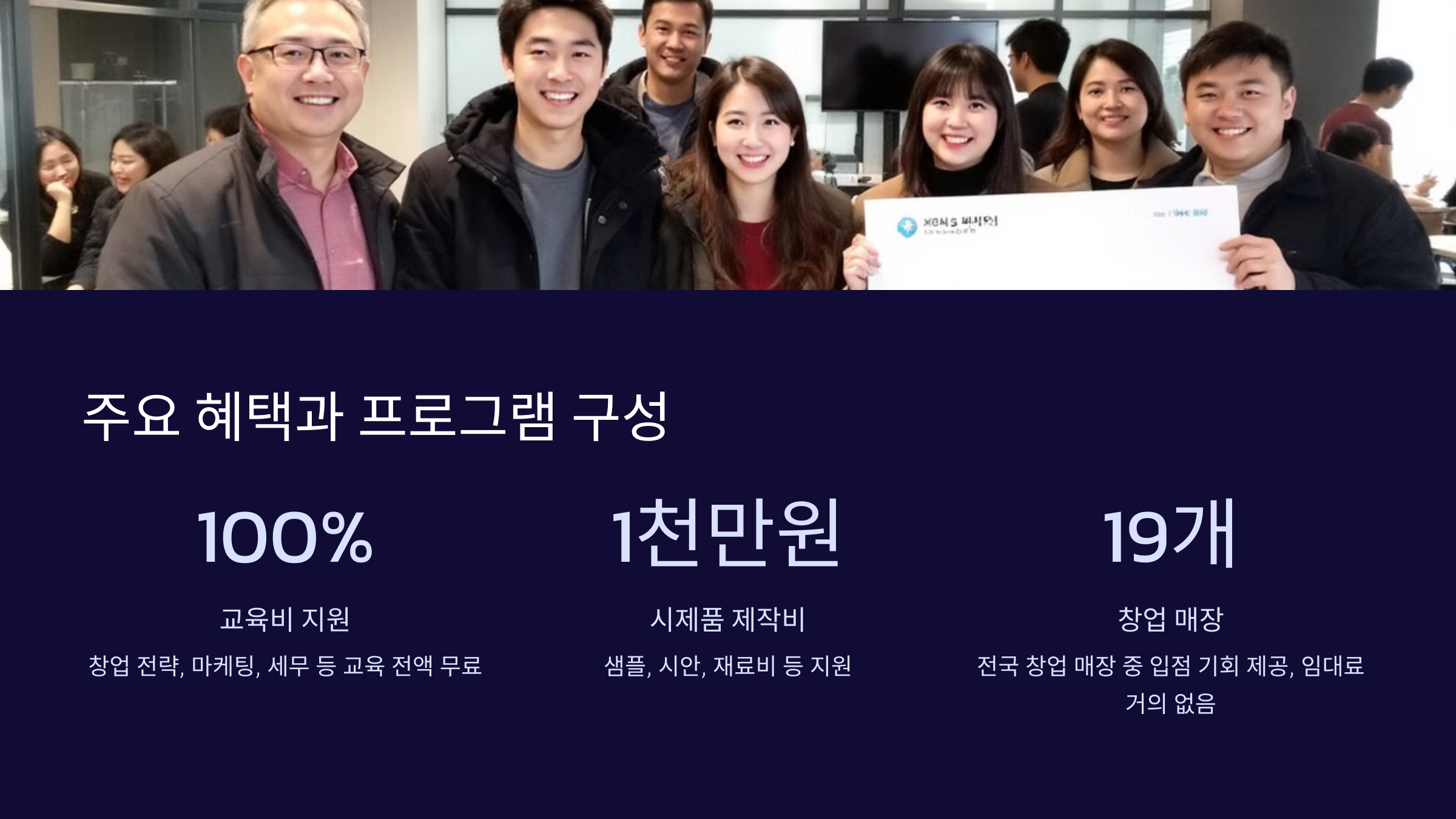 | 지원내용 | 교육비 전액 무료, 시제품 제작비, 점포 제공 |