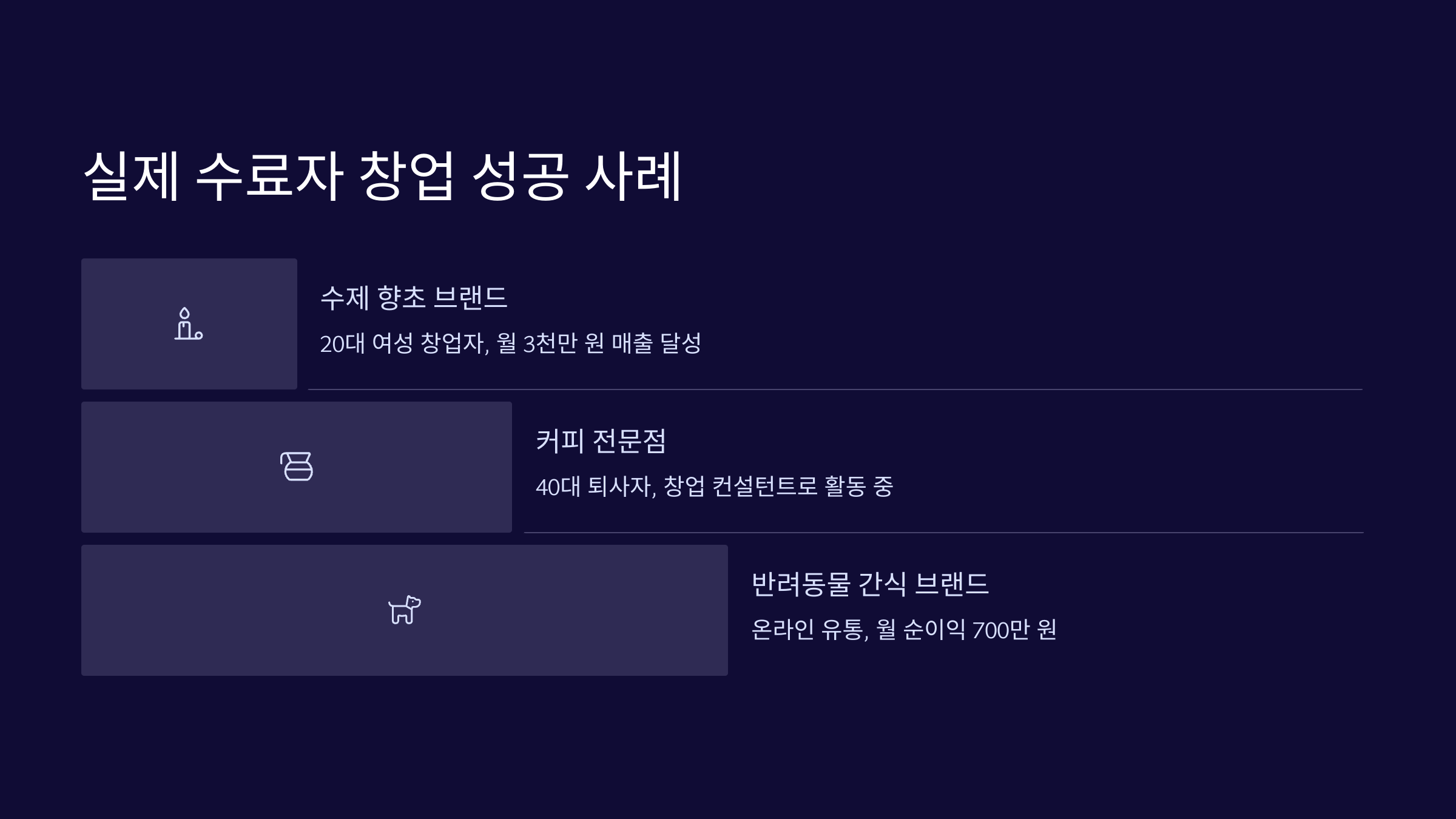 세 번째 사례는 온라인 기반의 반려동물 제품 브랜드 창업자예요. 이 분은 강아지용 수제 간식을 아이템으로 정했는데, 사관학교에서 받은 시제품 제작비로 안전성 테스트와 패키지 디자인을 완성했어요. 현재는 스마트스토어와 펫박람회를 통해 전국 단위로 유통 중이에요. 월 순이익 700만 원 이상이라고 하네요!