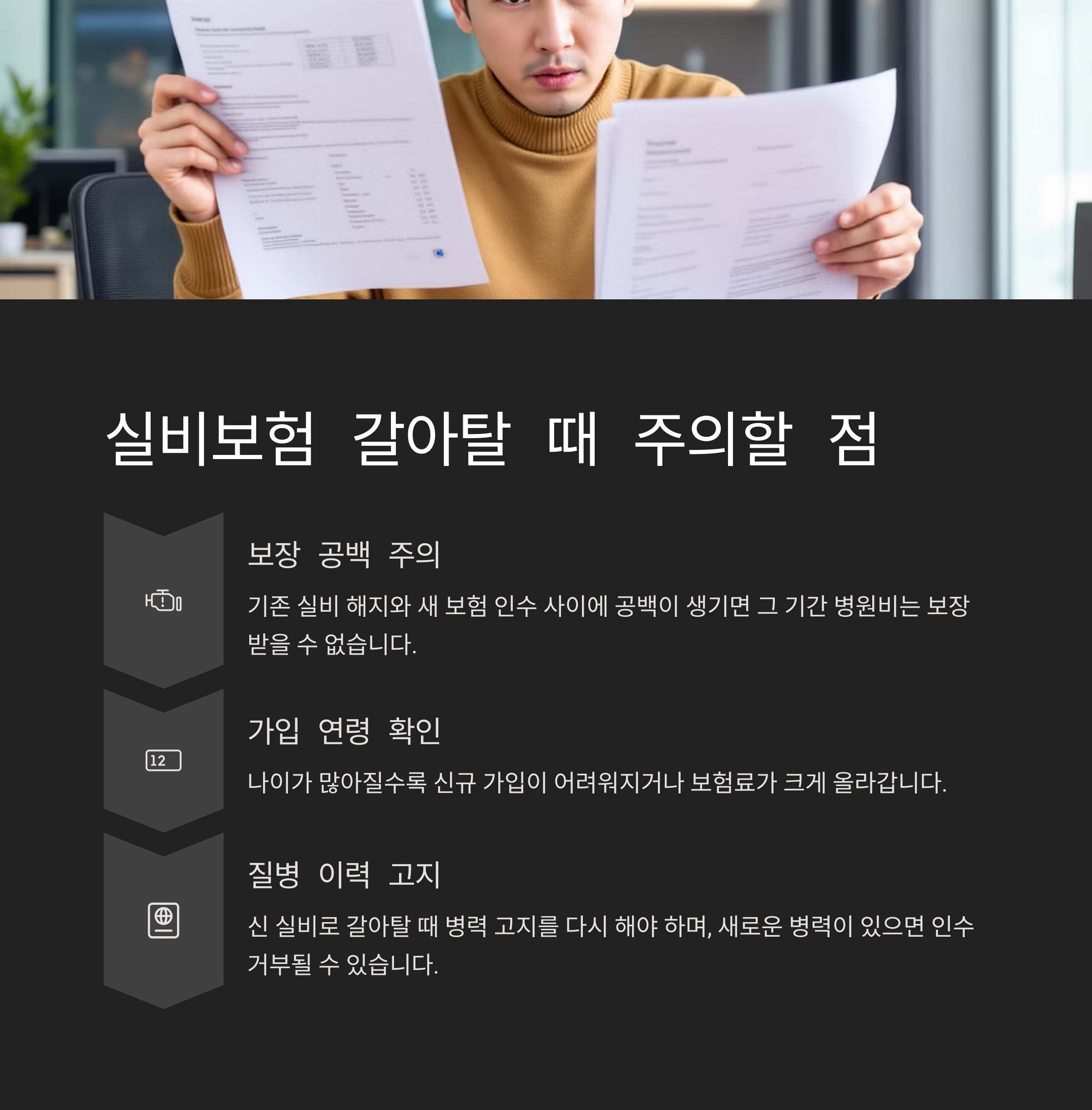 갈아타기로 마음먹었다면 중복 기간을 두는 게 안전해요. 새 보험의 인수가 확정될 때까지 기존 실비를 유지해야 해요. 그래야 혹시 모를 병원비 공백을 피할 수 있죠. 보험사도 이걸 권장하더라고요. 📝