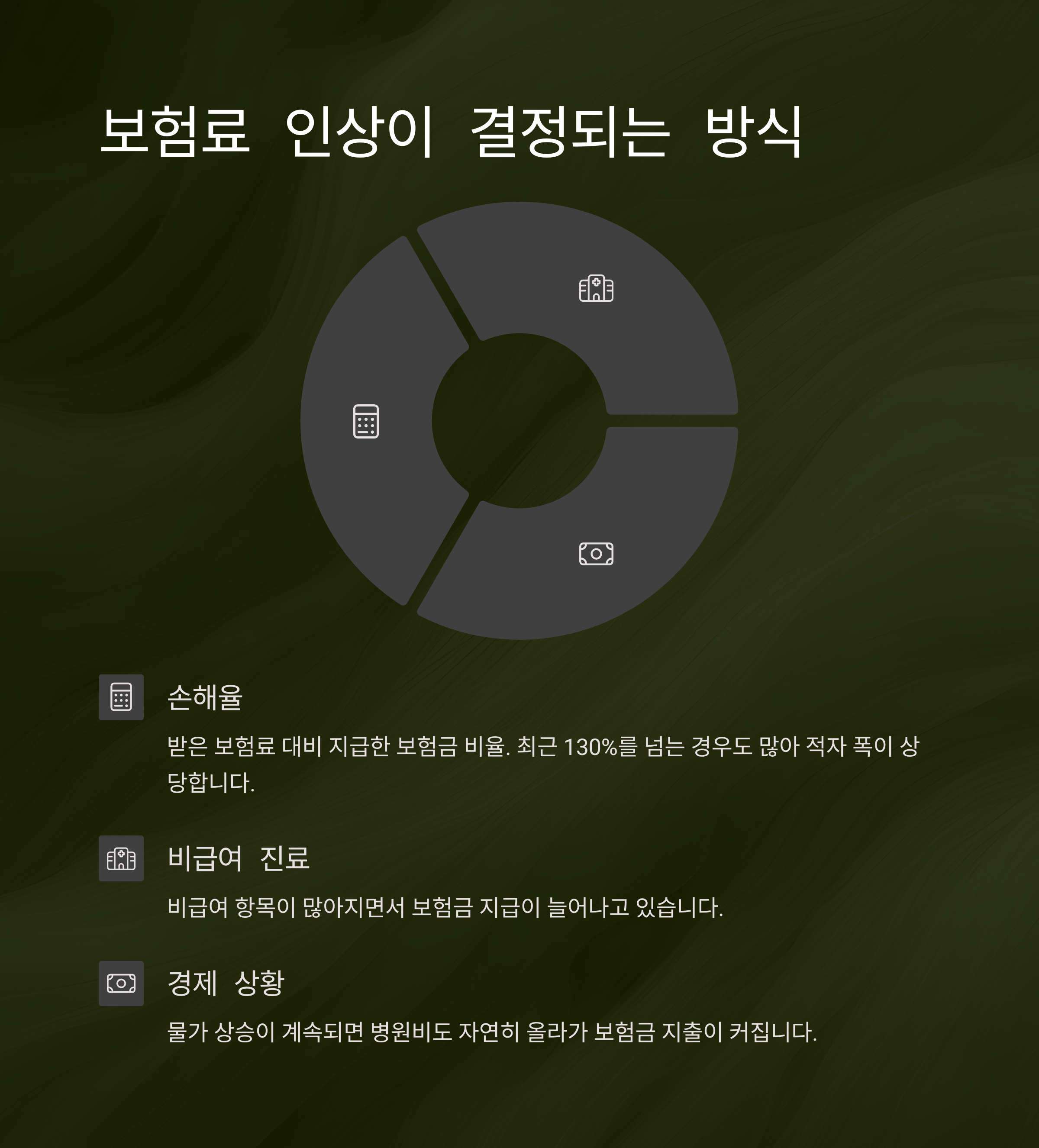 또 다른 이유는 고령화예요. 나이가 들수록 병원 갈 일이 늘고, 결국 보험금 청구가 많아지면서 전체 위험률이 올라가요. 그러니 보험사는 가입자들의 나이가 많아질수록 보험료를 높일 수밖에 없다고 하더라고요.