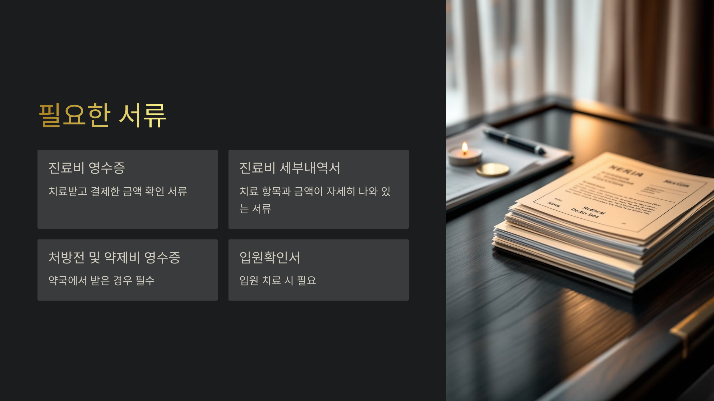 - 진료비 영수증 – 치료받고 결제한 금액을 확인하는 서류