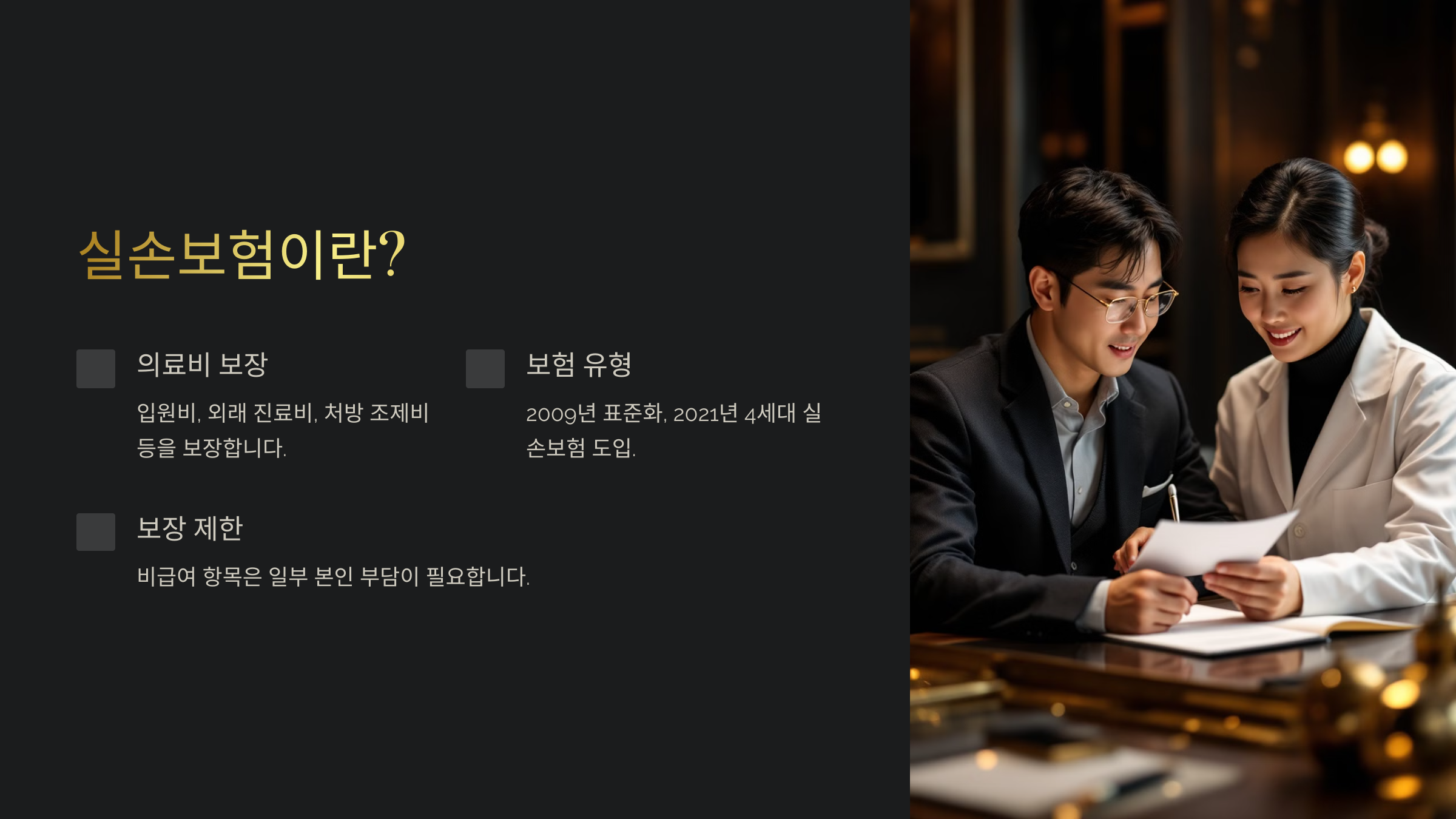 - 비급여 항목은 일부 보장되지 않음 (미용, 건강검진 등)