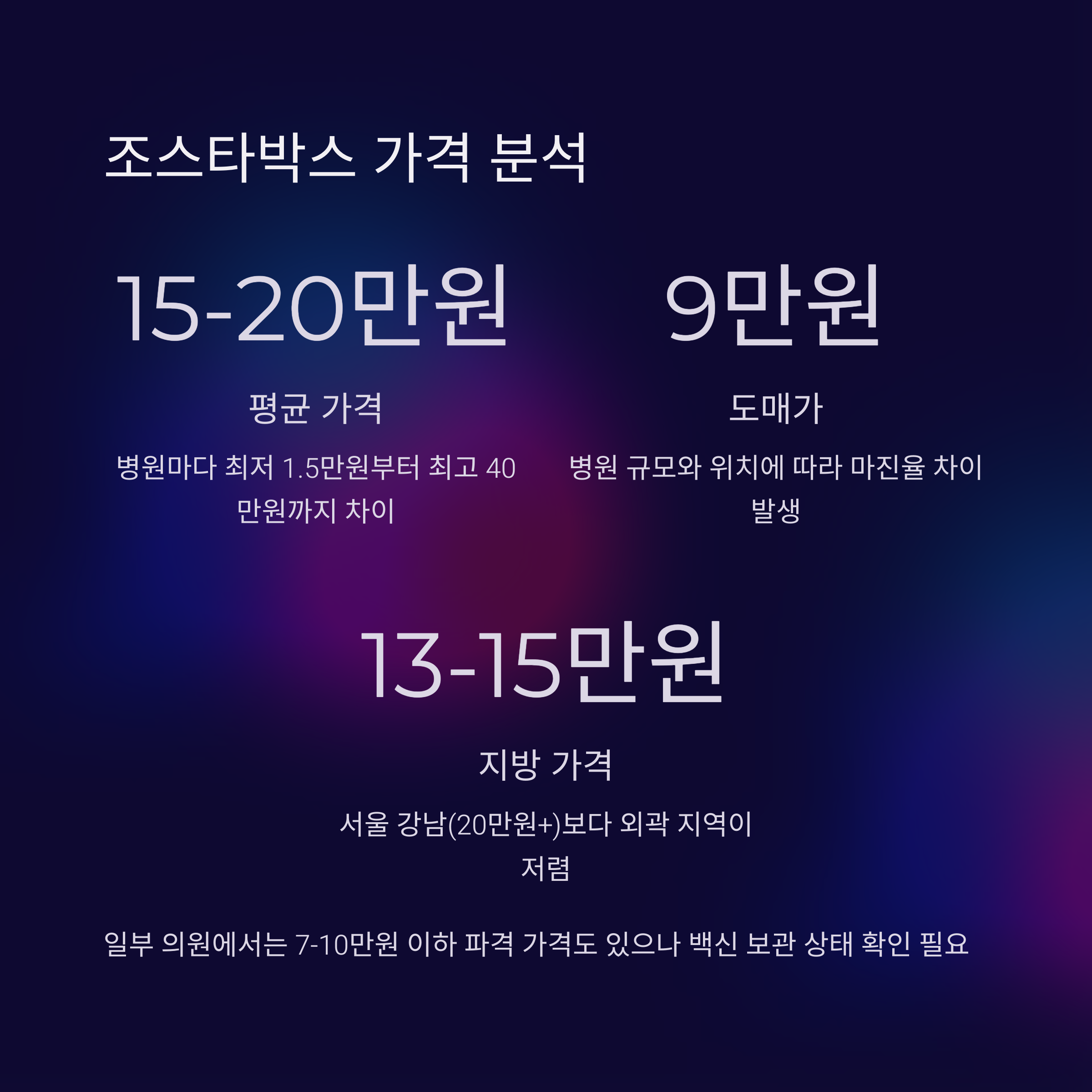 2023년 조사에 따르면, 서울 지역 의료기관의 조스타박스 가격은 평균 18만원이었어요. 강남구는 20만원 이상인 곳이 많았고, 외곽 지역은 15만원대가 주를 이뤘어요. 지방은 더 저렴해서 13-15만원에 접종 가능한 곳이 많아요. 📍