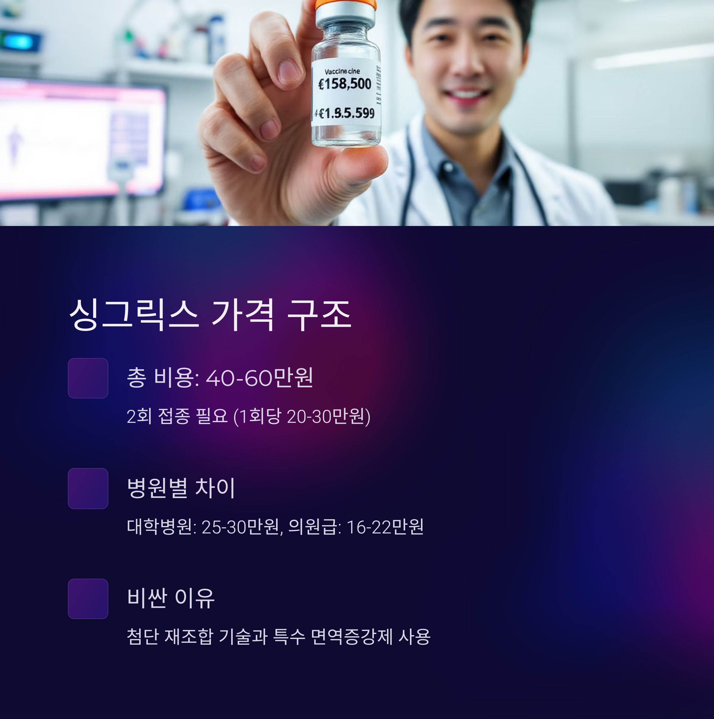 싱그릭스는 2회 접종이 필요한 백신으로, 총 비용이 40만원에서 60만원에 달해 경제적 부담이 큰 편이에요. 1회 접종 비용은 20만원에서 30만원 사이인데, 병원마다 가격 차이가 상당해요. 왜 이렇게 비싼 걸까요? 🤔