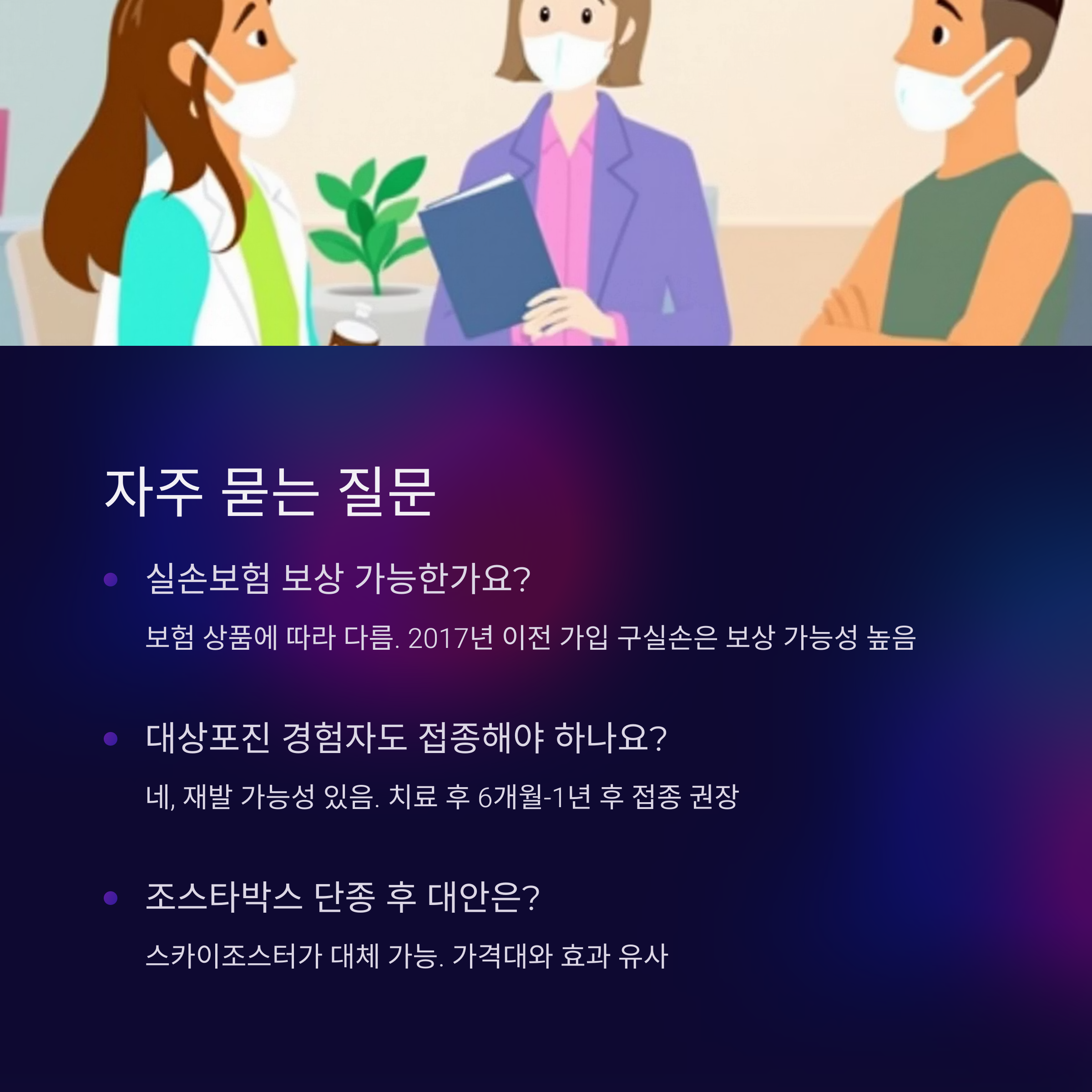 A6. 면역저하자는 반드시 싱그릭스를 맞아야 해요. 조스타박스는 생백신이라 면역력이 약한 분에게는 위험할 수 있어요. 항암치료 중이거나 면역억제제를 복용 중이라면 의사와 상담 후 적절한 시기에 싱그릭스를 접종하세요. 🏥