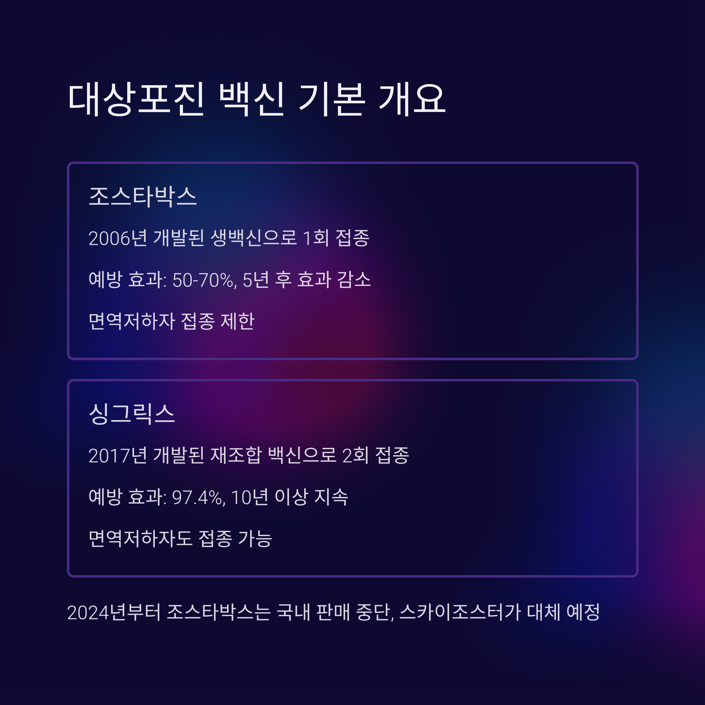 조스타박스는 2006년에 개발된 생백신으로, 약독화된 살아있는 바이러스를 사용해요. 1회 접종으로 완료되는 편리함이 있지만, 면역저하자에게는 접종이 제한돼요. 예방 효과는 50대에서 70%, 60대에서 64% 정도이며, 시간이 지날수록 효과가 감소하는 특징이 있어요. 💉