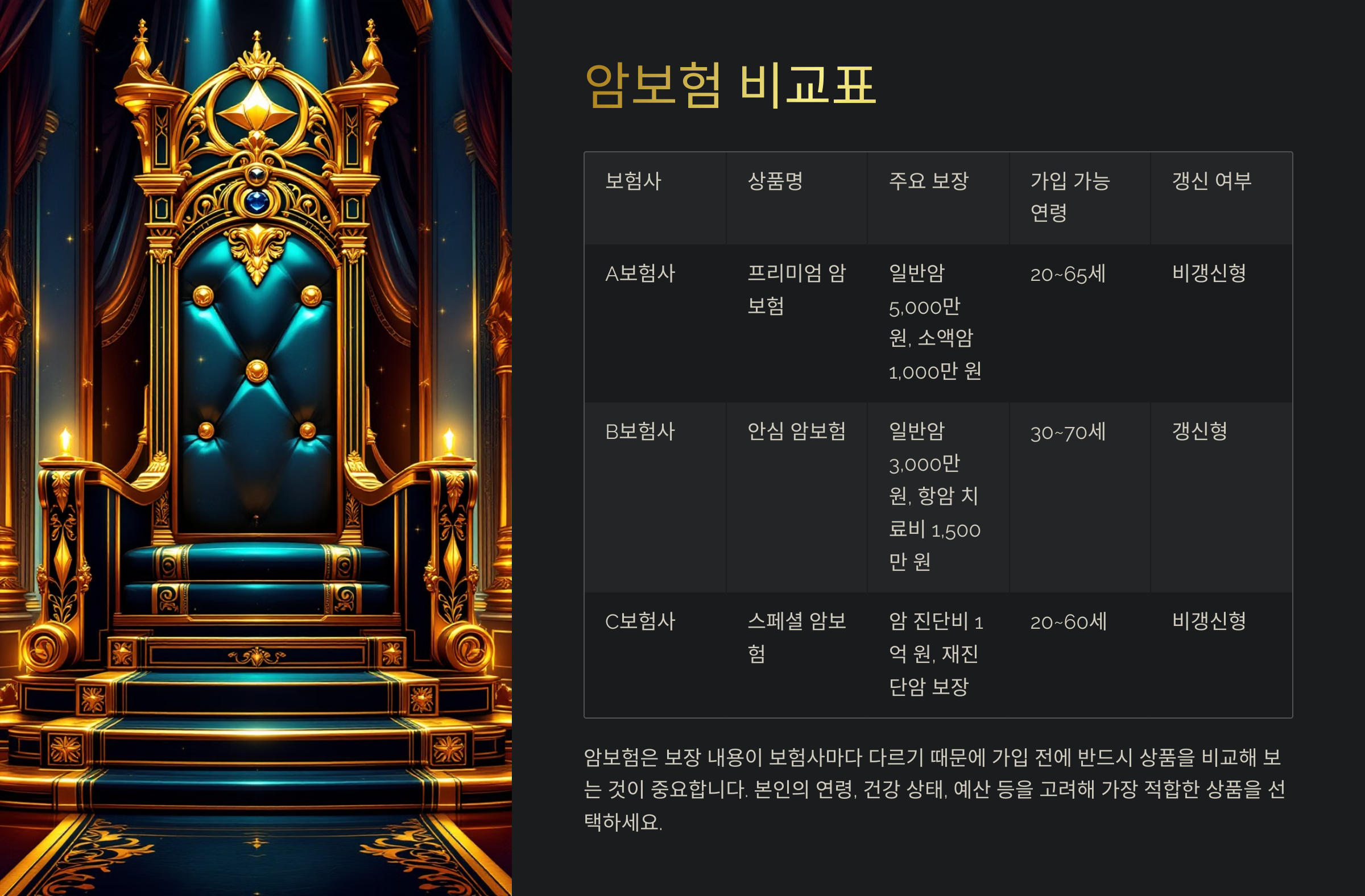| A보험사 | 프리미엄 암보험 | 일반암 5,000만 원, 소액암 1,000만 원 | 20~65세 | 비갱신형 |