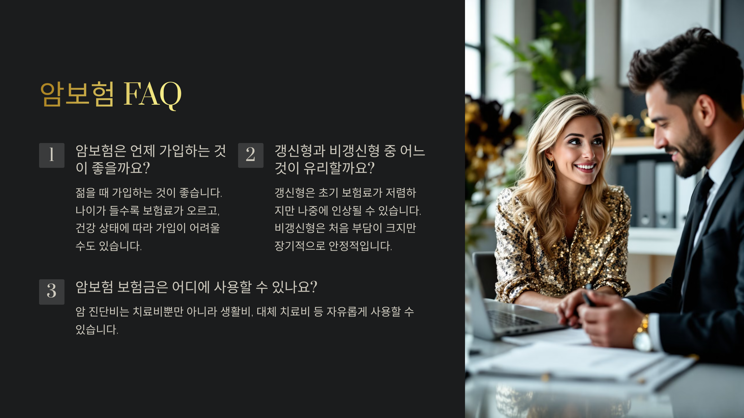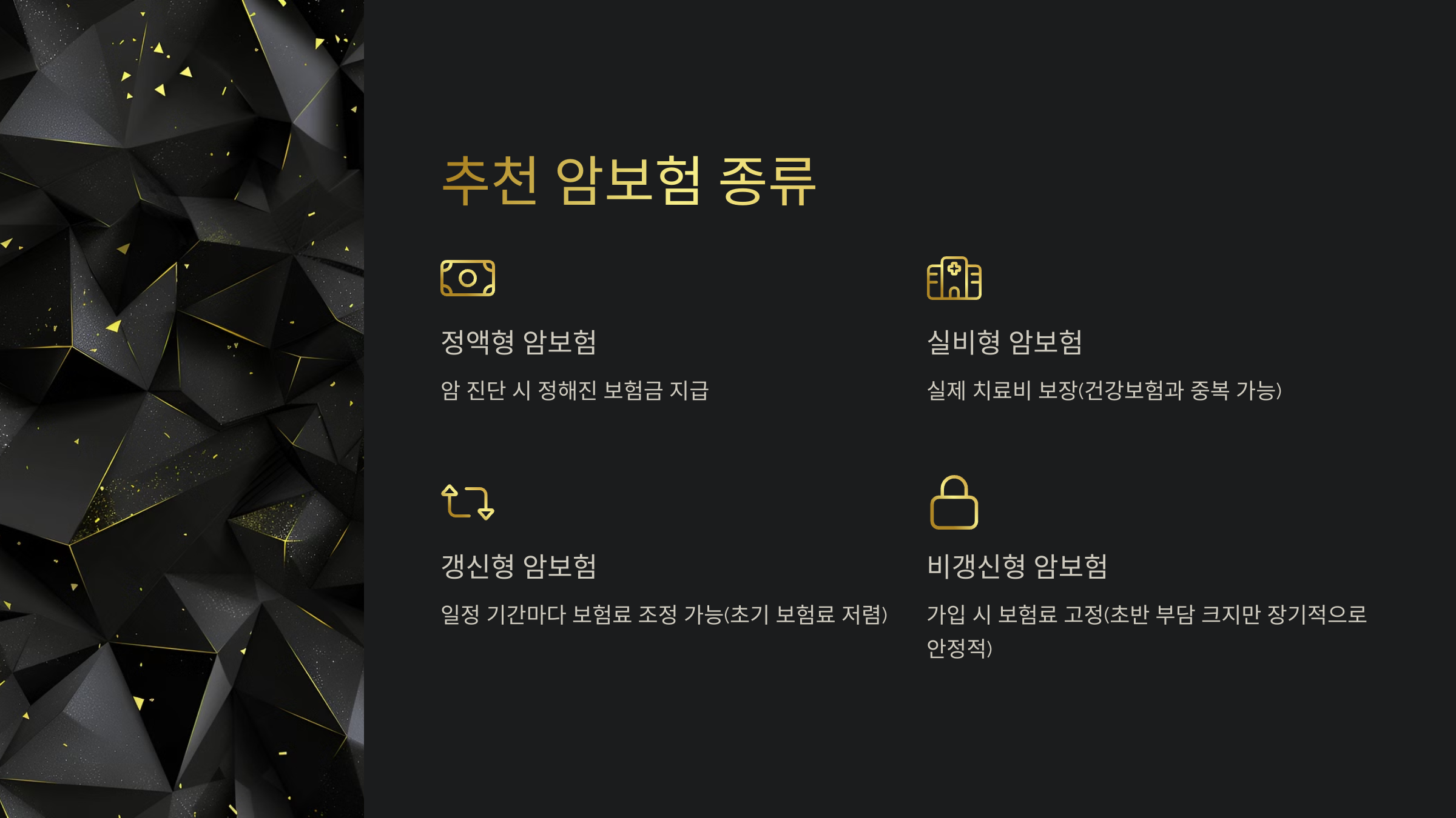 암보험은 보장 내용이 보험사마다 다르기 때문에 가입 전에 반드시 상품을 비교해 보는 것이 중요해요. 본인의 연령, 건강 상태, 예산 등을 고려해 가장 적합한 상품을 선택하세요. 😊