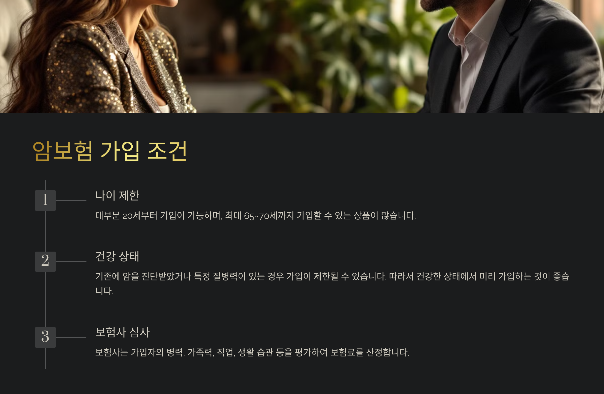 건강 상태가 중요한데, 기존에 암을 진단받았거나 특정 질병력이 있는 경우 가입이 제한될 수 있어요. 따라서 건강한 상태에서 미리 가입하는 것이 좋아요.