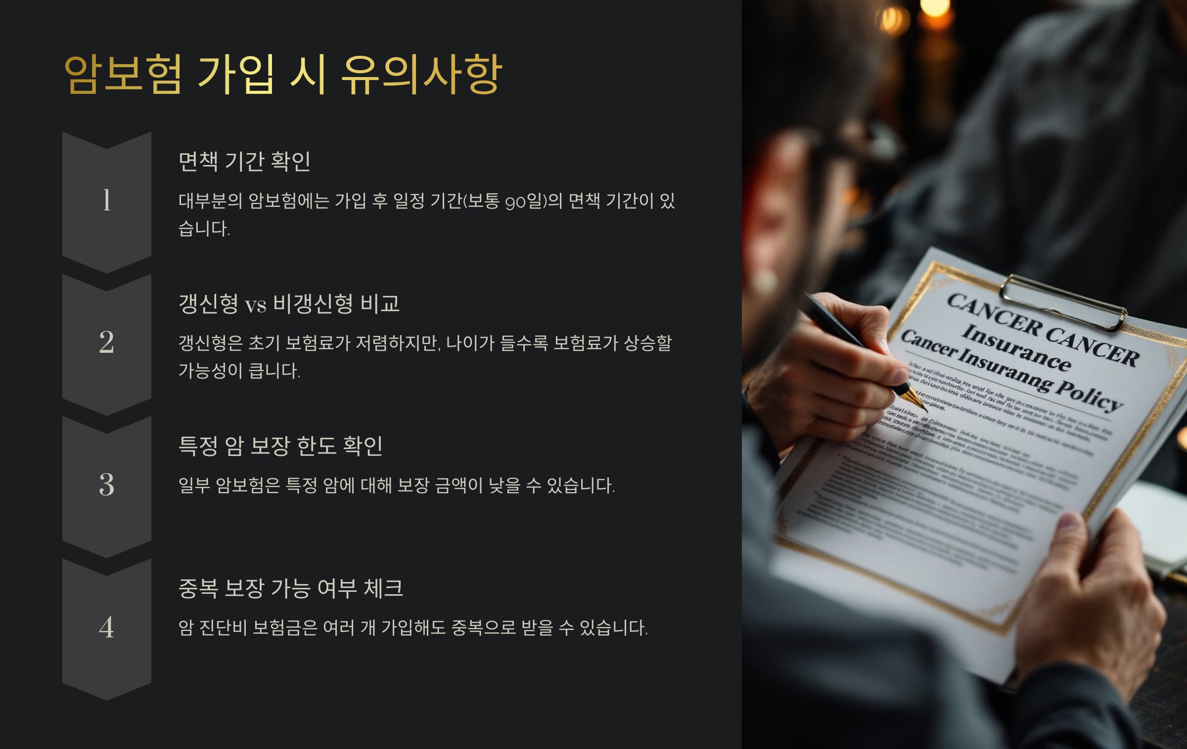 ① 면책 기간을 확인하세요. 대부분의 암보험에는 가입 후 일정 기간(보통 90일)의 면책 기간이 있어요. 이 기간 내에 암이 발생하면 보장이 되지 않아요.