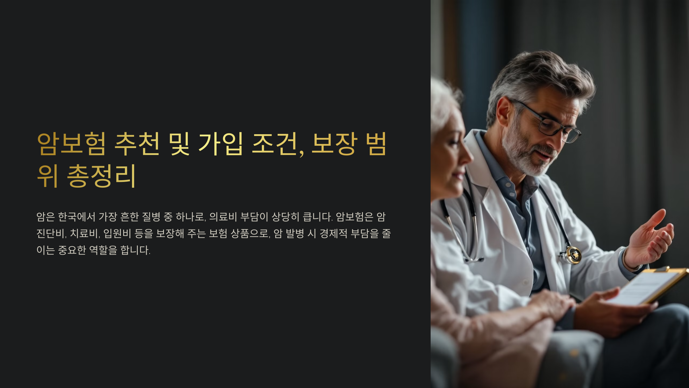 이 글에서는 암보험의 개념, 가입 조건, 보장 범위, 추천 상품, 가입 시 유의사항 등을 상세히 정리해 드릴게요. 🤓