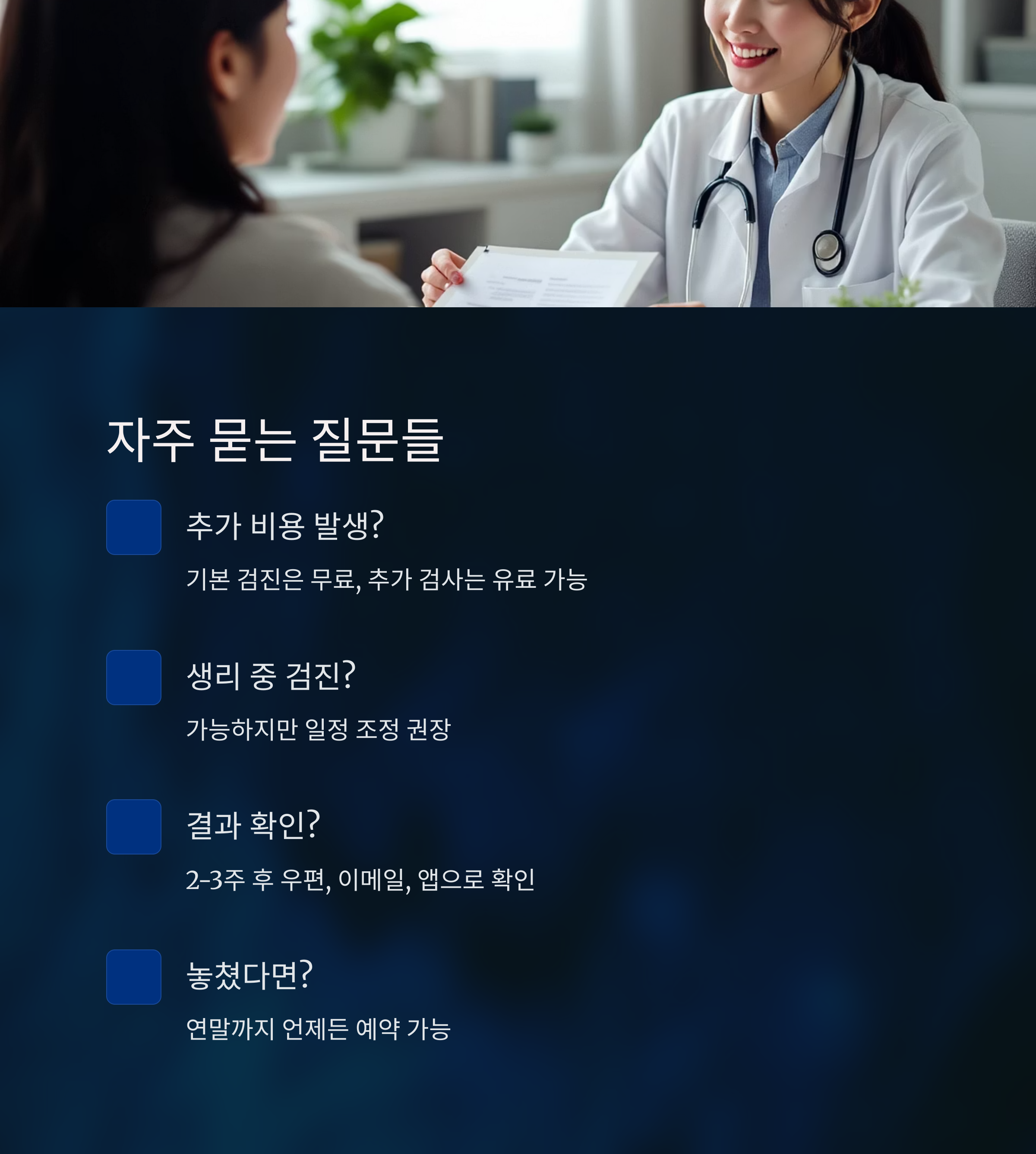 A7. 검진 기간 내(1월~12월)에는 언제든지 예약 가능해요. 하지만 그 해가 지나면 다시 대상자가 되기까지 2년을 기다려야 해요. 연말 전에 꼭 받는 걸 추천해요.