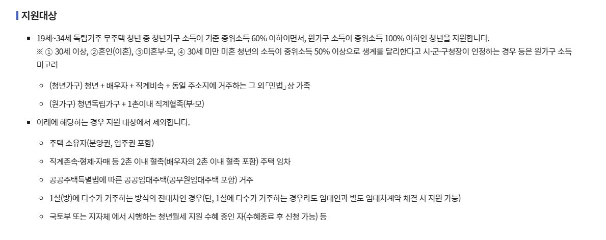 해당 정책의 지원 대상은 19세부터 34세까지의 청년 중에서, 아파트나 주택을 소유하지 않고 독립생활을 하는 사람들입니다. 청년가구의 소득이 전체 사회의 중위 60% 이하이면서, 해당 청년의 원가구(부모와의 가구)의 소득이 전체 사회의 중위소득 100% 이하인 경우에 해당되면 지원 가능합니다. 다음을 참조하시기 바랍니다.