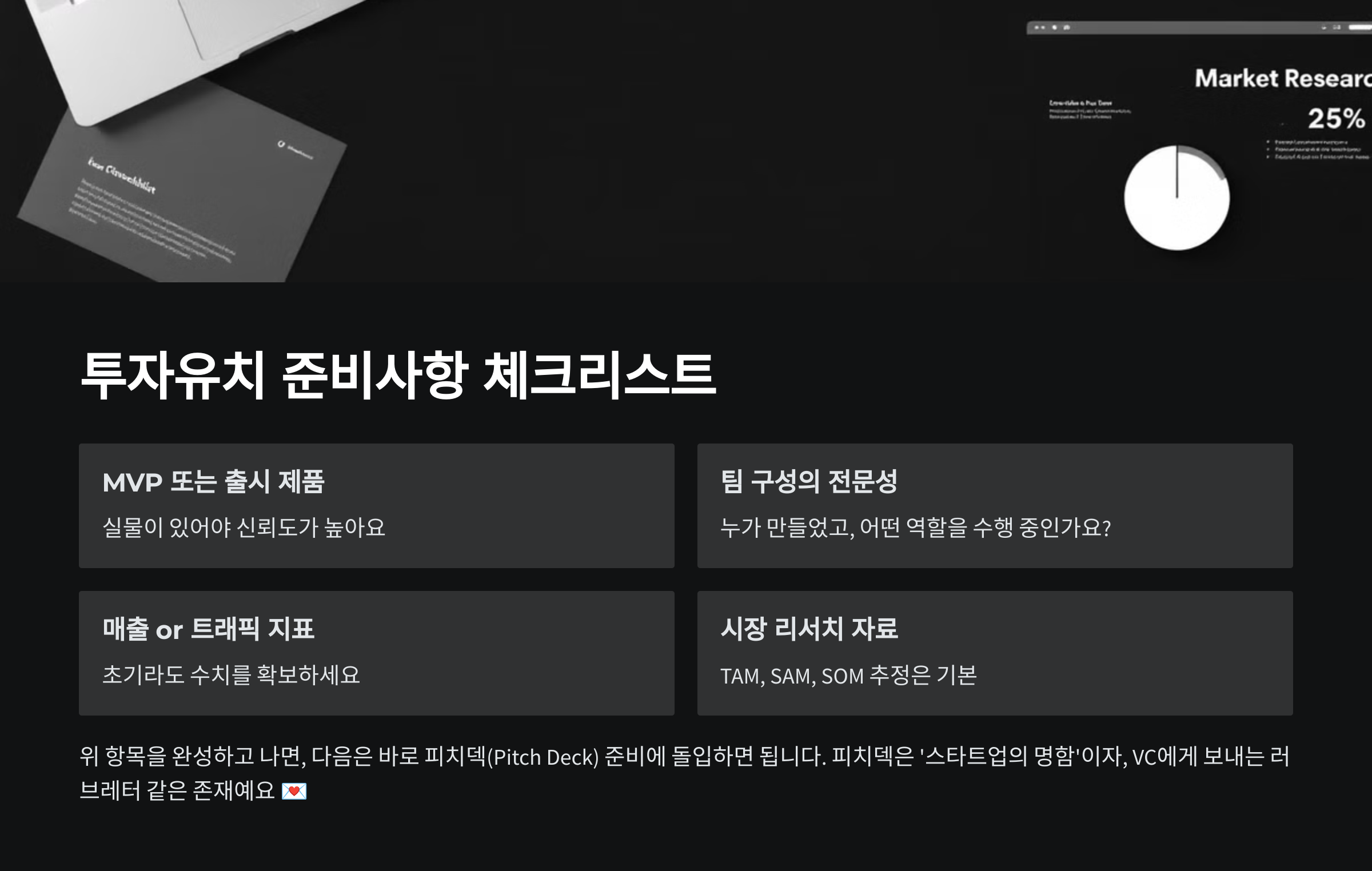 VC 미팅을 준비할 때는 단순히 아이템만 설명하려고 하지 말고, “이 팀에게 돈을 맡겨도 되겠다”는 확신을 주는 게 핵심이에요. 아래 체크리스트는 실제 투자자들이 가장 많이 보는 항목들이에요 ✅