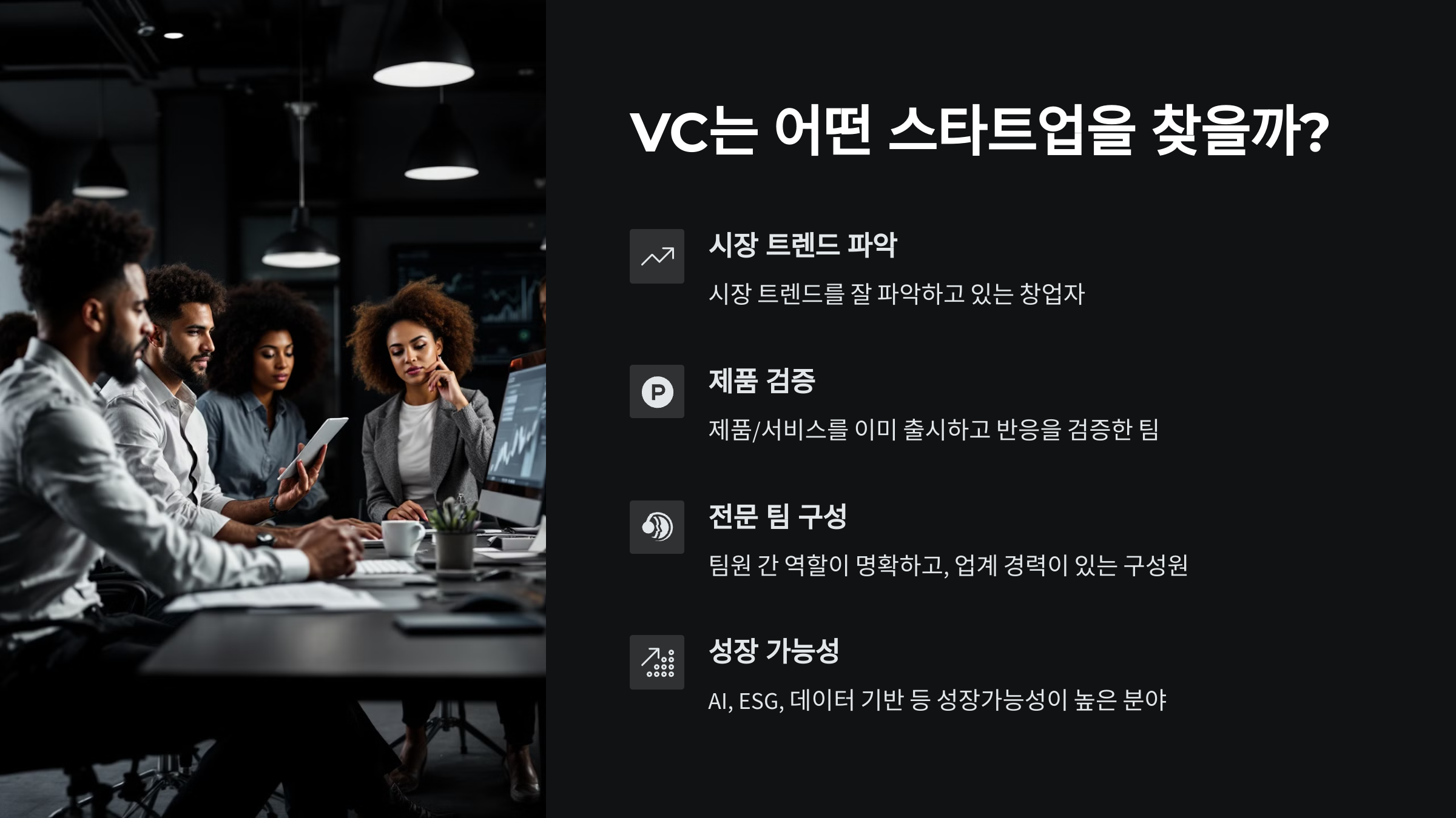 VC, 즉 벤처캐피탈은 ‘빠르게 성장할 수 있는 기업’을 찾고 투자하는 기관이에요. 아이디어보다 중요한 건 실행력, 팀 구성, 시장확장성이에요. VC는 “이 팀이 얼마나 빠르게 시장을 장악할 수 있을까?”를 보죠.