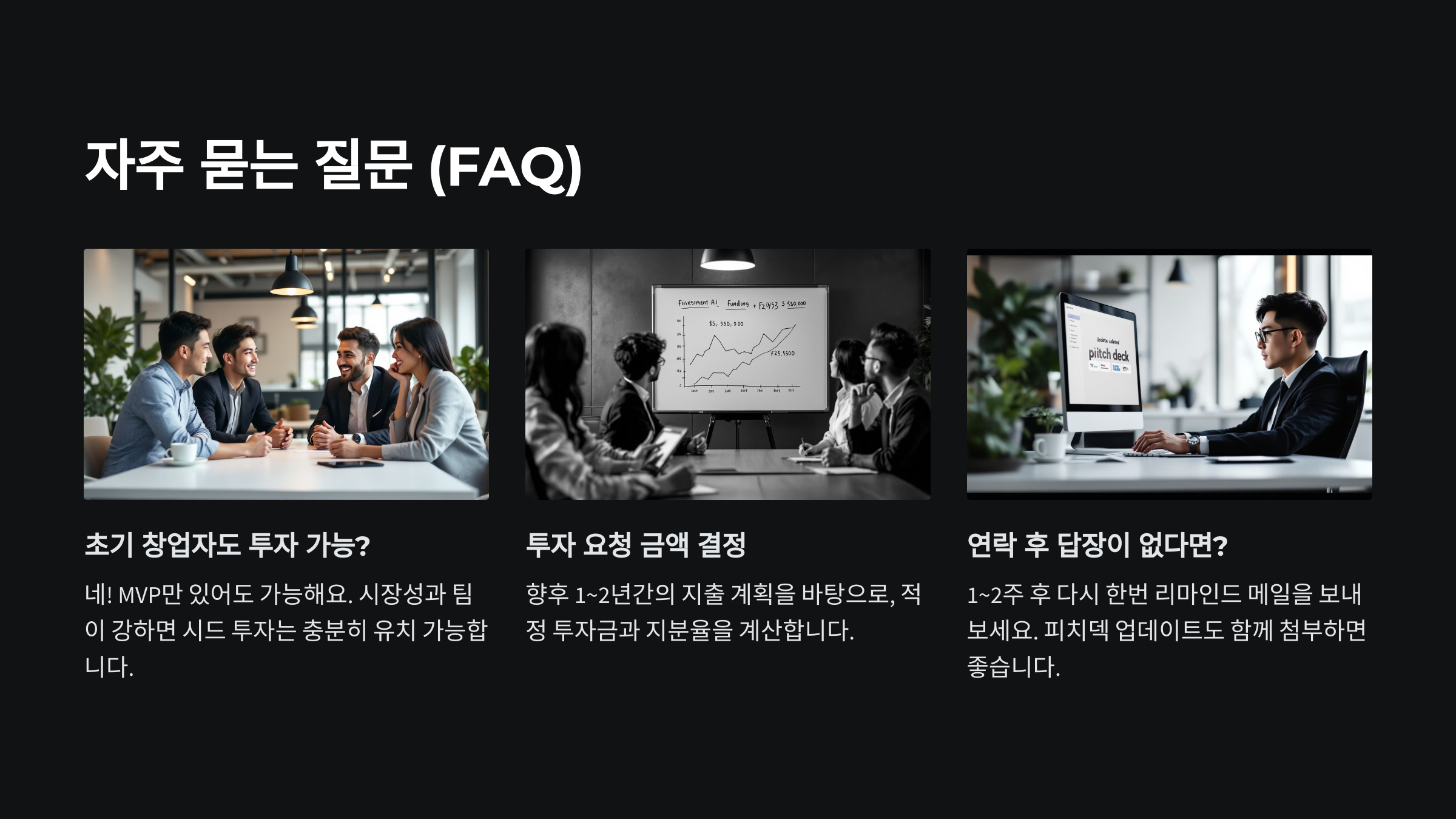 피치덱만 잘 만들어도 VC 입장에서는 “미팅 한 번 해볼까?”란 생각이 들게 돼요. 무턱대고 연락하기보단, 간결하고 임팩트 있는 자기소개 + PDF 피치덱 첨부는 필수예요.