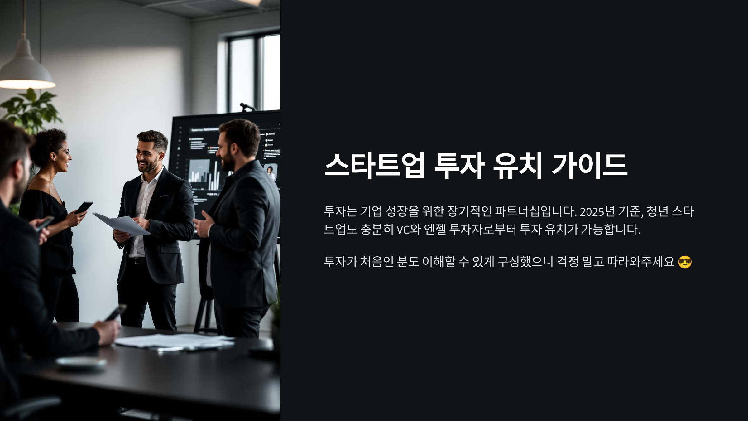 IR 발표까지 잘 끝냈다면, 이제 본격적으로 투자 유치에 도전해볼 차례예요. 지원금은 일회성이지만, 투자는 기업의 성장을 위한 장기적인 파트너를 만나는 일이죠. 2025년 기준, 청년 스타트업도 충분히 VC(벤처캐피탈)와 엔젤 투자자로부터 투자 유치를 받을 수 있어요!