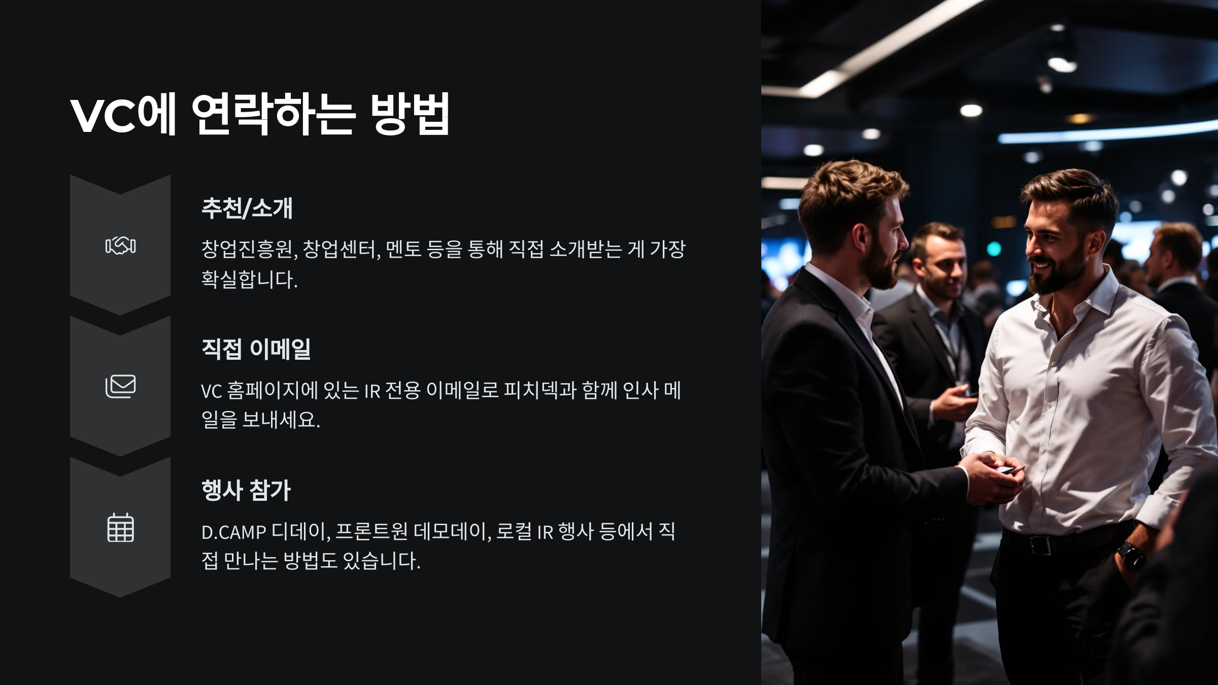 - ③ 행사 참가: D.CAMP 디데이, 프론트원 데모데이, 로컬 IR 행사 등에서 직접 만나는 방법도 있어요. 발표 후 명함교환과 후속 미팅으로 연결돼요.