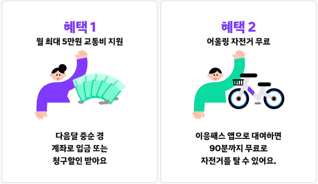 | 혜택 | 매월 최대 5만 원 교통비 지원 및 공공자전거 무료 대여 |