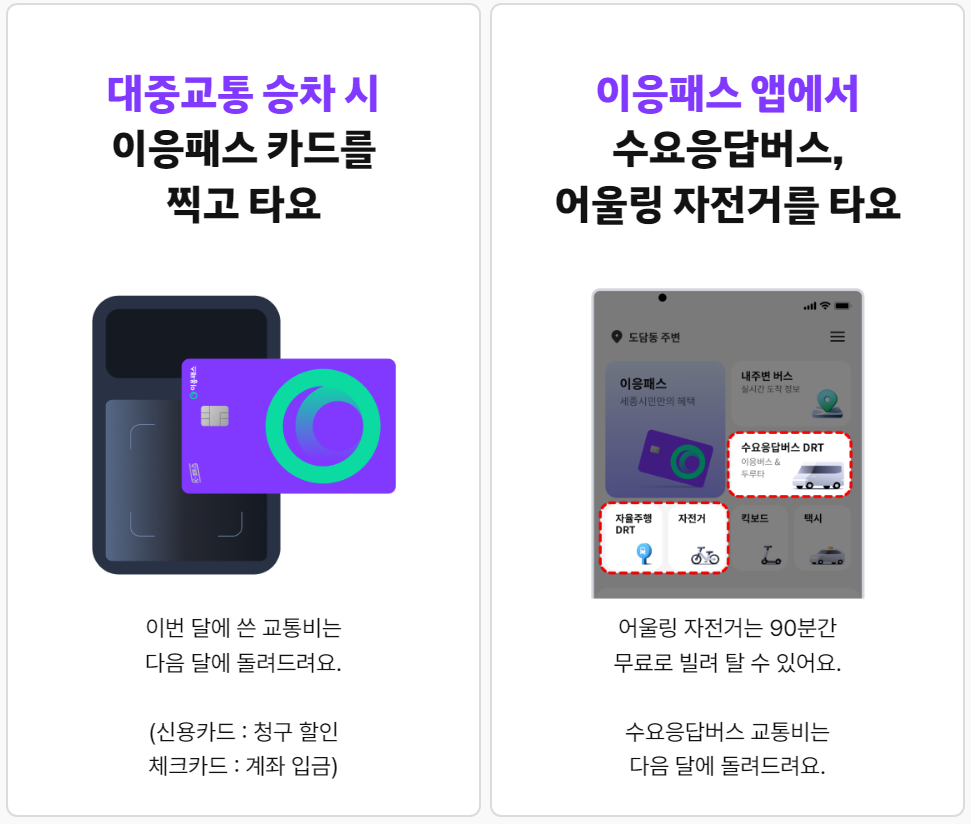 이외에도 이응패스를 통해 어울링 자전거를 1회 90분간 무료로 대여할 수 있으며, 이용 횟수에 제한이 없어 효율적으로 활용 가능합니다.