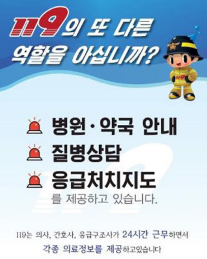 ✔️구급상황관리센터 (119): 응급상황 시 구급차 호출과 인근 응급의료기관 안내를 받을 수 있습니다.