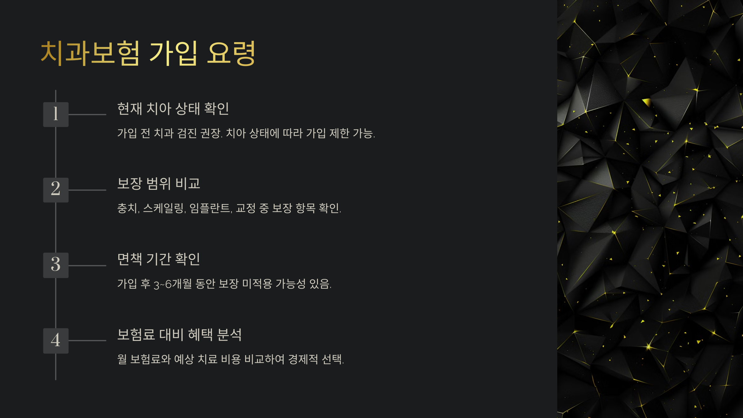 다음으로, 치과보험을 가입할 때 고려해야 할 사항을 알아볼게요.