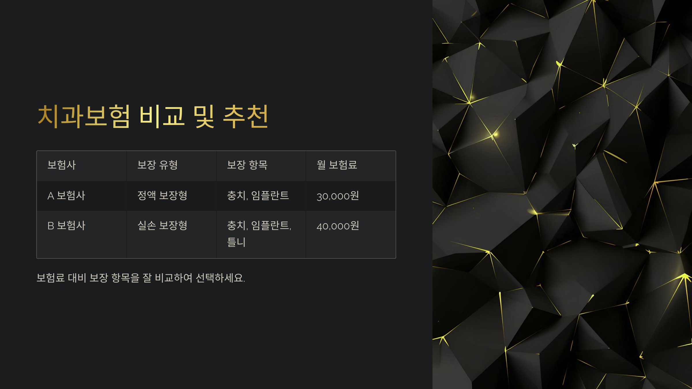 2. 💡 보장 범위 비교: 충치, 스케일링, 임플란트, 교정 중 어떤 부분을 보장하는지 확인하세요.