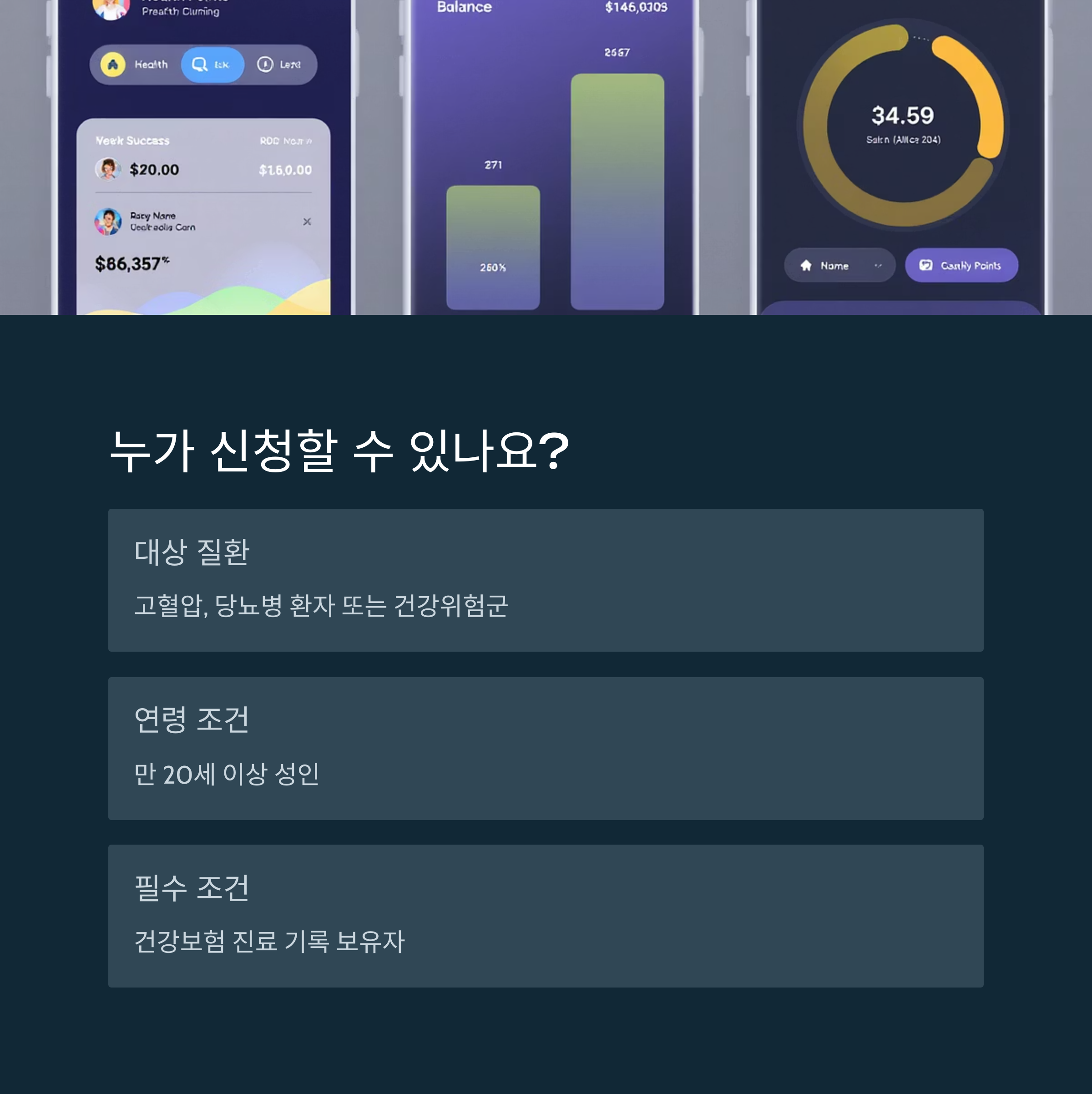 현재 기준으로는 고혈압, 당뇨병을 앓고 있는 만성질환자 또는 진단을 받지 않았더라도 혈압/혈당 수치가 경계수준 이상인 위험군이 주요 대상이에요.
