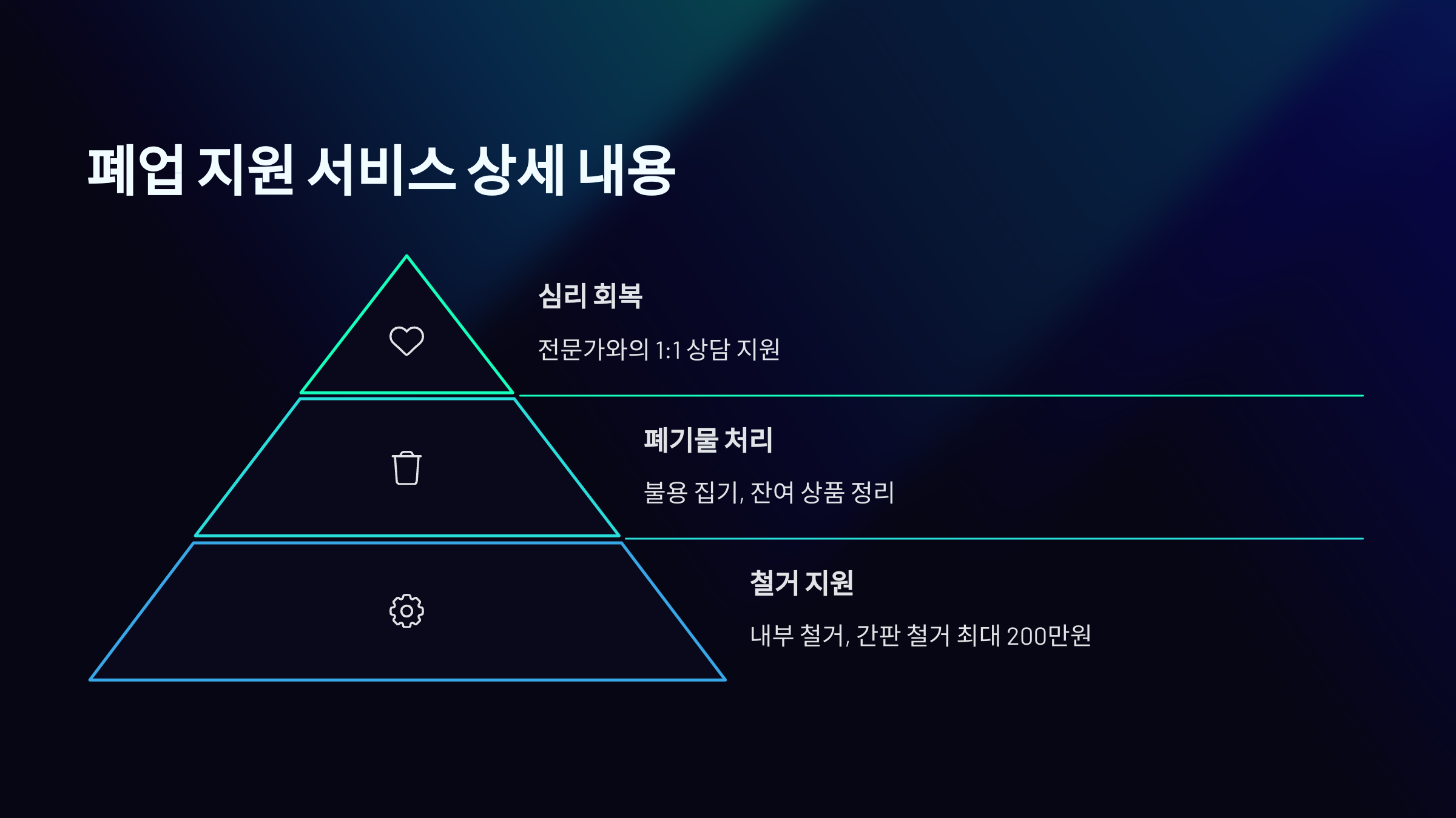 | 철거비 | 내부 철거, 간판 철거 | 실비 지원 (최대 200만 원) |