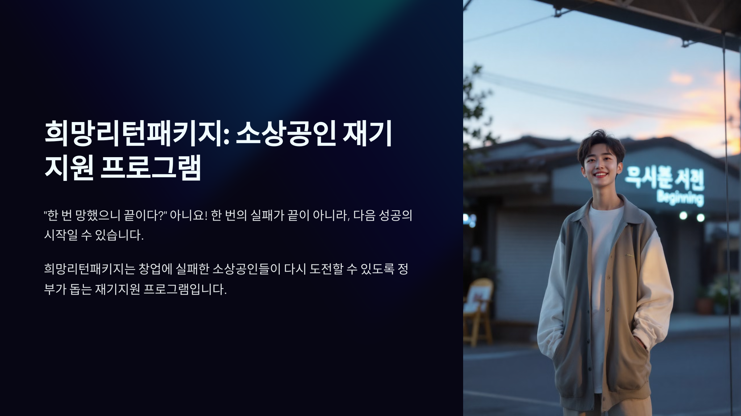사업에 실패하고 나면 금전적인 손해뿐 아니라 자신감, 심리적인 상처도 함께 오죠. 희망리턴패키지는 그런 상황에 놓인 소상공인을 위해 폐업 정리부터 재창업까지 전 과정을 단계별로 지원해주는 체계적인 제도예요.
