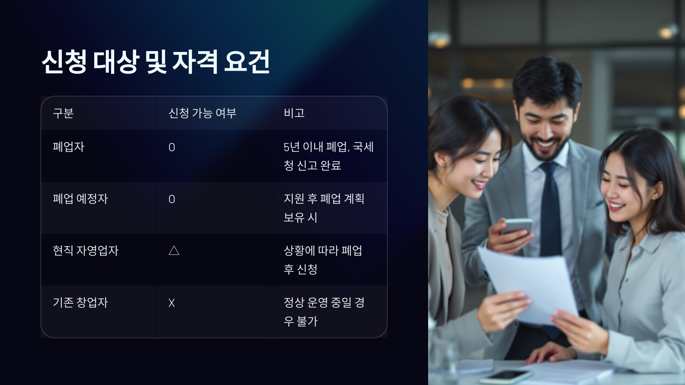 | 현직 자영업자 | △ | 상황에 따라 폐업 후 신청 |